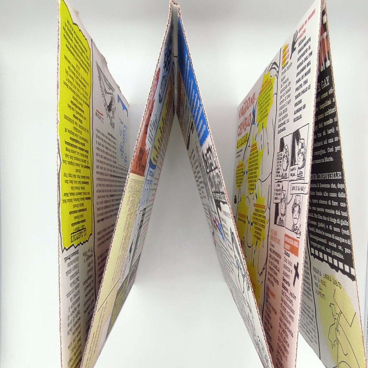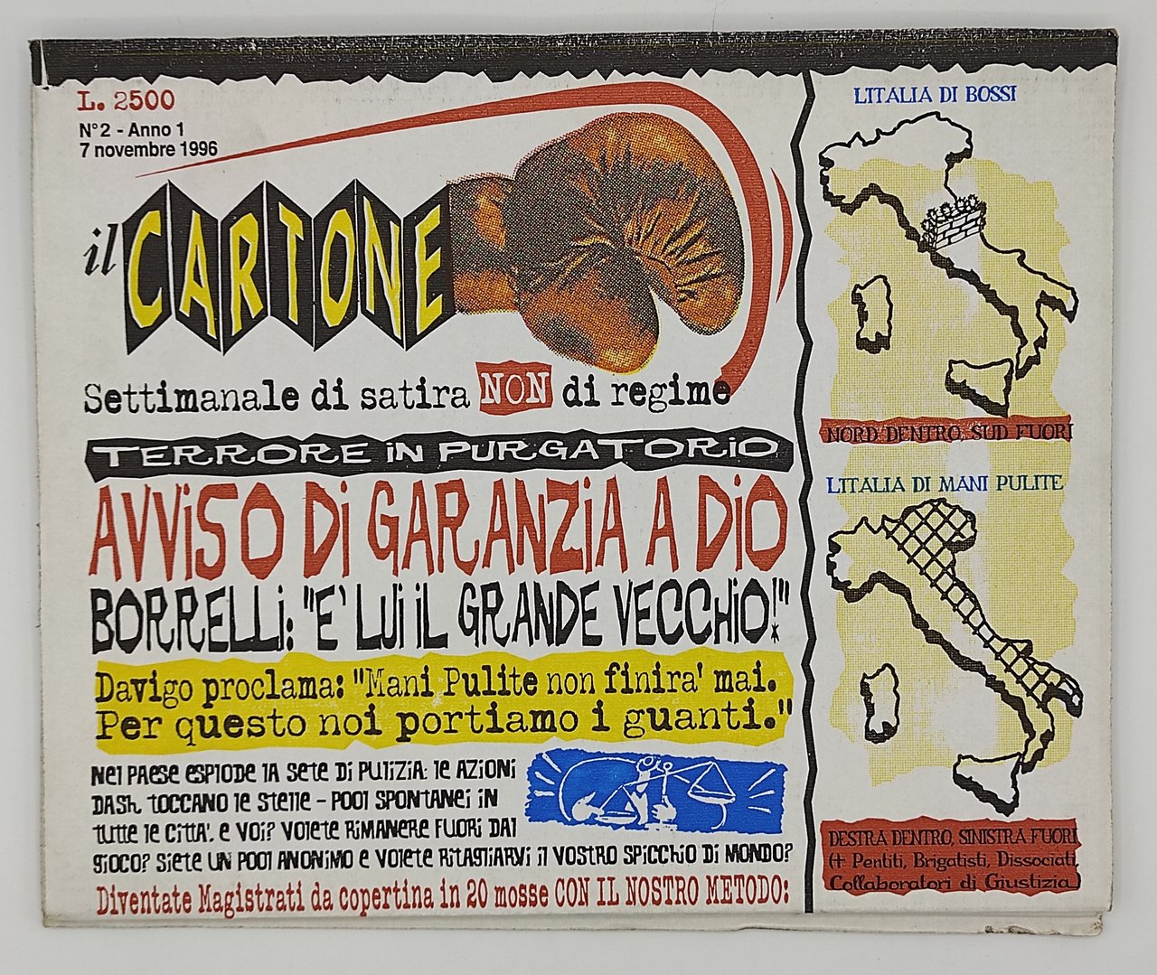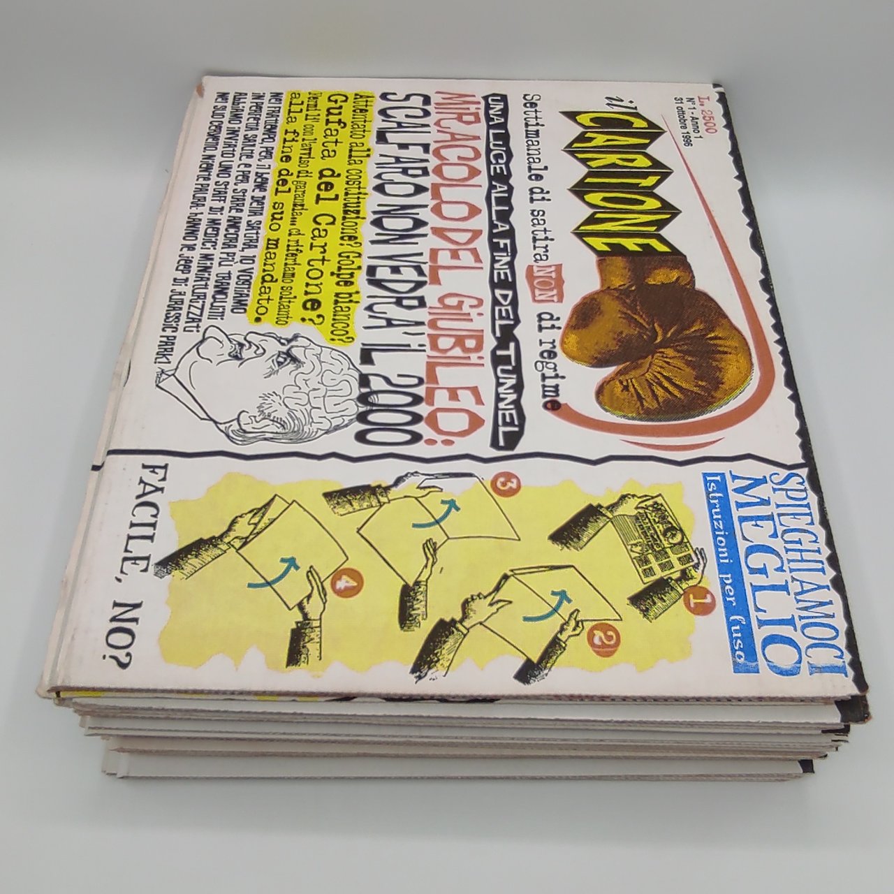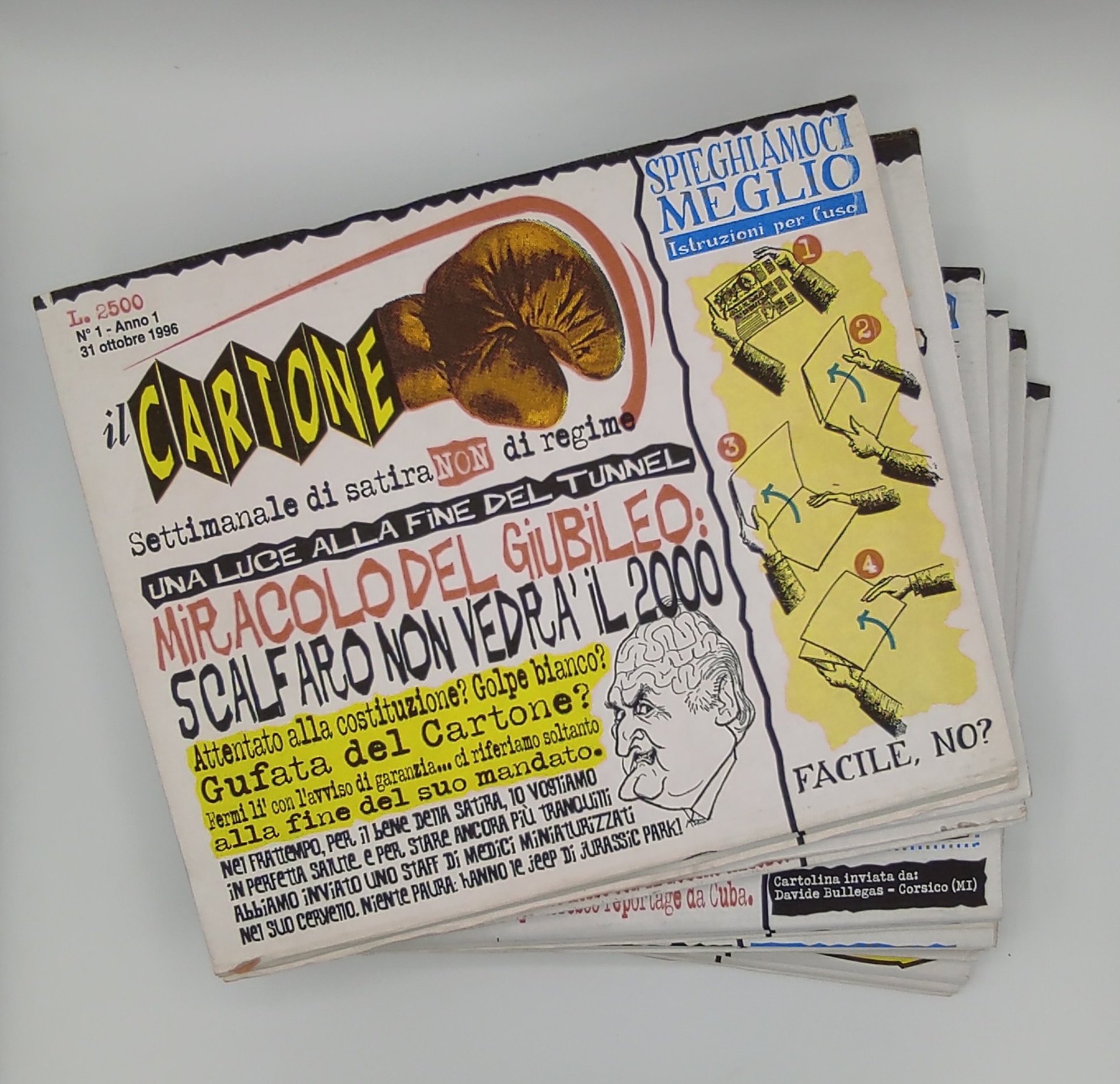 Settimanale satirico del 1996, composto di otto pagine stampate su cartone a quattro colori da leggersi a scorrimento verticale. Il lotto include i numeri 1-7 + una seconda copia del numero 2. In condizioni molto buone.