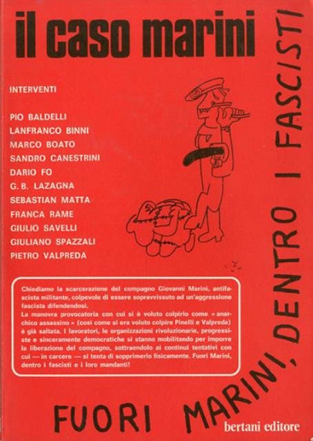 103 p. : ill. ; 22 x 15 cm. Quaderni di intervento militante, 1. Giovanni Marini (Sacco, 1º febbraio 1942–Salerno, 23 dicembre 2001) è stato un anarchico, poeta e scrittore italiano. Divenne noto per essere presente il 7 luglio 1972, nel corso di una rissa, quando morì Carlo Falvella, un giovane militante del FUAN. Per la morte del giovane fascista Marini venne condannato a 12 anni di reclusione. Nel 1974, nel corso del processo, Soccorso Rosso pubblicò questo pamphlet intitolato «Il caso Marini» nel quale si illustrava una posizione di difesa nei confronti dell'anarchico. Parteciparono alla stesura del documento Pio Baldelli, Lanfranco Binni, Marco Boato, Sandro Canestrini, Dario Fo, Giambattista Lazagna, Sebastian Matta, Franca Rame, Giulio Savelli, Giuliano Spazzali e Pietro Valpreda. Brossura editoriale, coperta illustrata in cartoncino flessibile colorato (b/n e rosso). All'interno varie fotografie e vignette in b/n. Codice libreria 9350.
