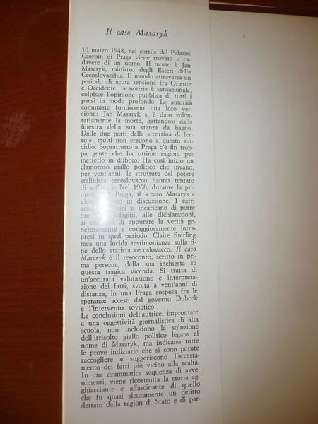 DESCRIZIONE: Club degli Editori Milano 1970, Collana Fatti e Figure, br. ed. t.t. con sovracc. ill. pp. 325 in 8° con alcune ill. b/n f.t. a fine vol. L'assassinio del ministro degli esteri della Cecoslovacchia nel 1948. Il caso politico di Masaryk a Praga nel 1948, un giallo politico che nemmeno la "primavera di Praga" ha saputo risolvere. Indice completo in foto a fine inserzione. CONDIZIONI: Buone, modeste tracce di sporco alla sovracc. PESO / WEIGHT: 602 gr. without package
