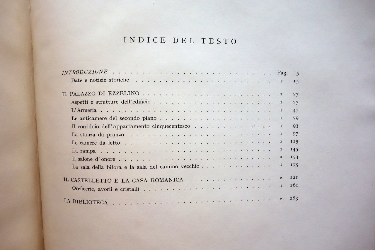 Officine Grafiche Carlo Ferrari, Venezia, 1940; cm 32x21; pp. 342 con centinaia di ill. in b/n nel t. e fuori t., raffiguranti esterni, interni del castello e numerosissime suppellettili - tessuti - opere d'arte. Pregevole legatura coeva in mezza pergamena (dorso e angoli), con titolo in oro entro tassello al dorso; nervature; piatti rivestiti in bella carta a colori. Custodia in cartonato anch'esso rivestito in carta a losanghe colorate (bianco e arancio). Alla seconda di copertina breve nota bibliografica del precedente proprietario.