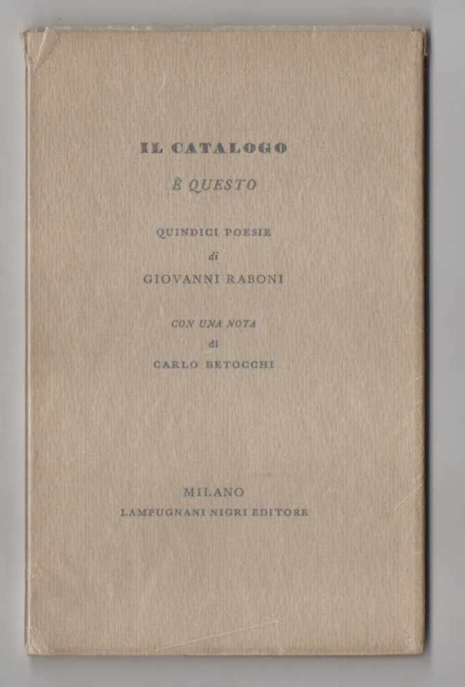 LIBROEdizione originale.Esemplare non numerato, in ottime condizioni. Conserva il pergamino editoriale.Rara opera prima di Raboni, libro considerato capostipite della rinascita della lirica italiana nell’ultimo Novecento. «Il mio primo libro è, curiosamente, il secondo — o viceversa», ebbe a dichiarare l’autore: succede infatti che il poeta affida la pubblicazione della sua prima raccolta, «L’Insalubrità dell’aria», a Scheiwiller, il quale si prese del tempo, tanto da consentire la pubblicazione di questo «libretto in pochi esemplari d regalare agli amici». «Come prefazione pensai di metterci [.] due lettere che Betocchi mi aveva scritto. Così è nato ‘Il Catalogo è questo’ [.] volendo, lo si potrebbe considerarare come un’anticipazione del primo libro riassuntivo, ‘Le case della Vetra’, uscito nel 1966 da Mondadori. L’unica cosa sicura è che col passare del tempo è diventato un oggetto piuttosto raro [.]. Dell’impostazione grafica del libro e della sua realizzazione mi occupai personalmente, andando diverse volte nello studio officina di quello straordinario artigiano che era lo stampatore Luigi Maestri. [.] Il risultato mi sembrò allora, e continua a sembrarmi, decisamente gradevole. Vanni Scheiwiller mi telefonò per dirmi che era “il libro più bello dell’anno”. [.] Delle 15 poesie della raccoltina, 14 passarono (infiltrandosi, per così dire, fra quella dell’‘Insalubrità dell’aria’) nelle ‘Case della Vetra’ . Una (‘Primitivo’) non l’ho ripubblicata invece, né allora né mai, e non figura nemmeno nel volume di ‘Tutte le poesie’» (Raboni, Il catalogo è questo, Wuz 2 marzo 2003, pp. 3-4).