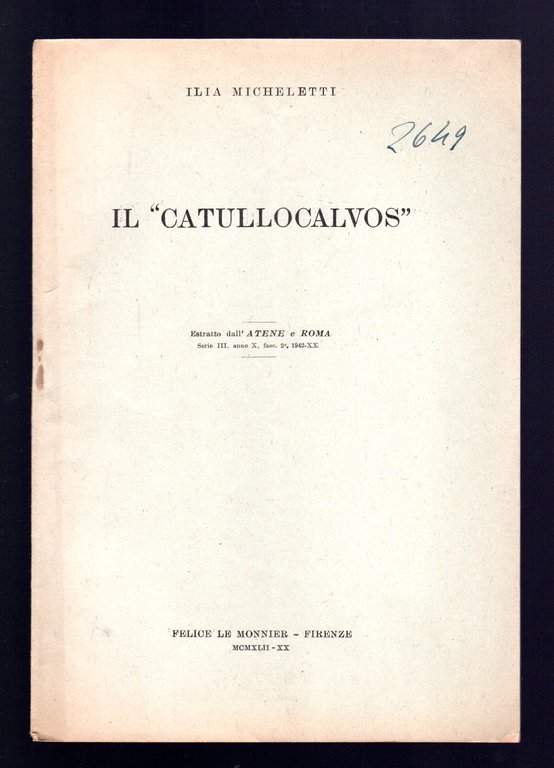 Opuscolo vintage. Estratto dall'Atene e Roma Serie III - Anno X - Fasc. II 1942. Segni di biro in copertina. Piega centrale. Ordinario segno del tempo.