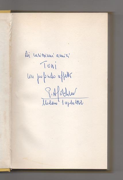 LIBROEdizione originale.CON AUTOGRAFO.Imperfezioni al taglio, nel complesso un bell’esemplare. Dedica autografa dell’autore ad una carta bianca: «Ai carissimi amici Toni con profondo affetto P. A. Soldini[.] Milano agosto 1962».Singolare «diario», composto da immagini, riflessioni e descrizioni che se pur autonome compongono il ritratto autobiografico dell’autore.
