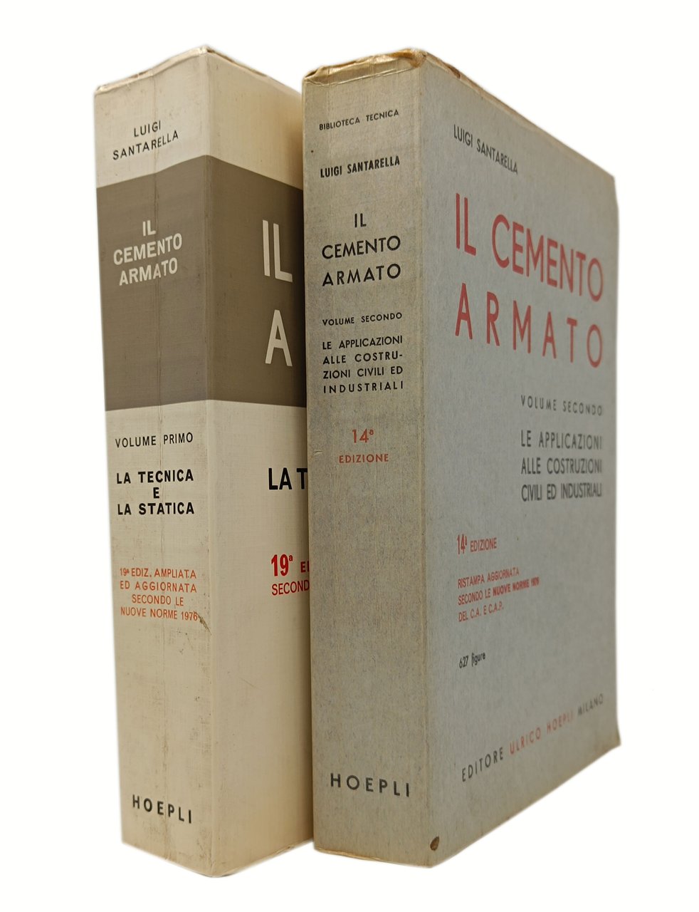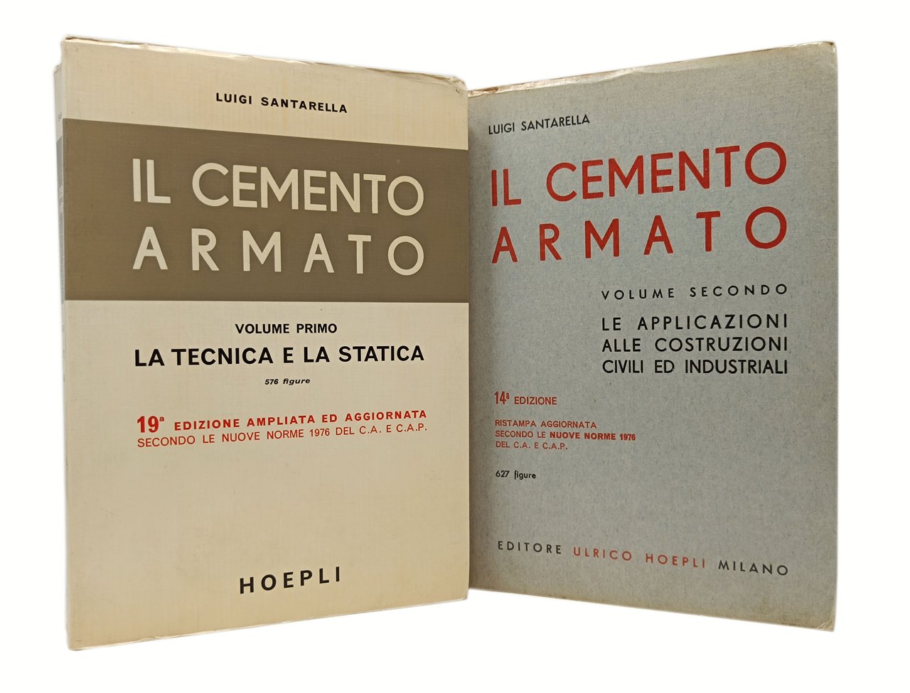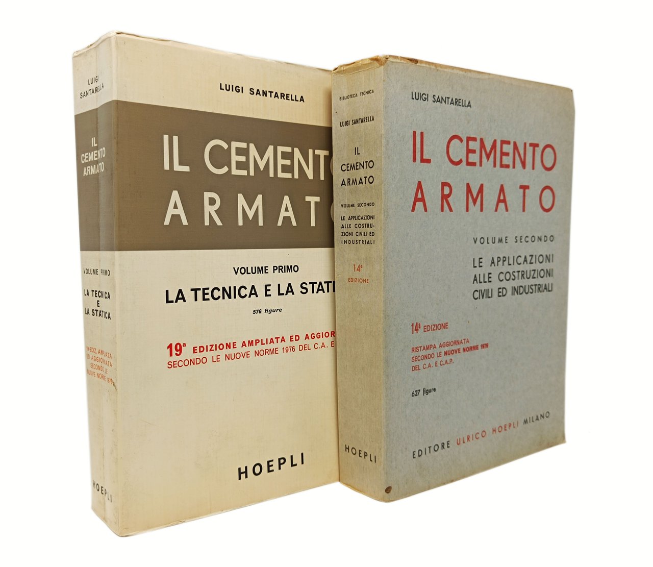 'Il cemento armato' opera completa di Luigi Santarella in due volumi: Volume I 'la tecnica e la statica', Volume II 'Le applicazioni alle costruzioni civili ed industriali'. Hoepli, 1977 (19° edizione ampliata e aggiornata del volume primo, 14° edizione ristampa aggiornata volume secondo). Pagine: XXVII + 1003; XX + 821. Formato: 17,5 x 24,5 cm circa. Stato di conservazione: lievissimi segni del tempo (pieghe sui dorsi causate dall'apertura dei volumi e qualche sporadico e leggero ingiallimnto) ma, nel complesso, due volumi decisamente buoni (privi di sottolineature, appunti, firme di appartenenza, timbri o altri segni nel testo). brossure editoriali con copertine flessibili con alette. Opera ricca di figure in nero nel testo (576 figure nel volume primo, 627 figure nel volume secondo). Il più famoso ed utilizzato testo per la teoria e il calcolo del cemento armato.