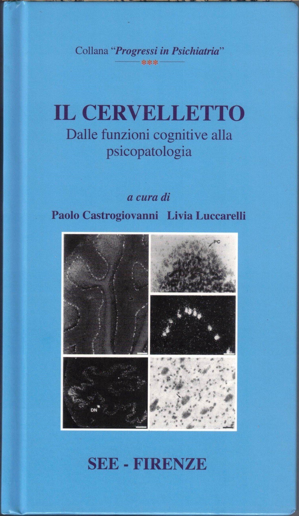 Il cervelletto. Dalle funzioni cognitive ella psicopatologia, a cura di Paolo Castrogiovanni e Livia Lucarelli, See Editrice, Firenze 2000, pp. 214, ill. b.n., cm 22, cart. ed. con titoli al dorso e titoli e ill. b.n. al piatto. Collana Progressi in psichiatria. Indice: Presentazione – Autori – Capitolo I. Meccanismi di controllo cerebellare: dal movimento alla dismetria del pensiero, di B. Ghelarducci, A. Gemignani e L. Sebastiani – Capitolo II. Cervelletto, cognitività, emozioni: modelli teorici interpretativi, di N. Magnani et al. – Capitolo III. Studi neuropsicologici sulla funzione cerebellare, di G. Bonelli et al. – Capitolo IV. Cervelletto e comportamento. Deficit procedurale e controllo affettivo, di M. Molinari, V. Filippini e M. G. Leggio – Capitolo V. Compromissione cognitiva nella patologia, di S. Passero – Capitolo VI. Lesioni cerebellari e funzioni mentali: osservazioni cliniche in pazienti con danno cerebellare acuto, P. Panicucci e M. Guazzelli – Capitolo VII. Cervelletto e schizofrenia: una revisione degli studi di neuroimaging, di A. Rossi e P. Prosperini – Capitolo VIII. Il ruolo delle anomali del cervelletto nell’autismo, di R. Canitano e M. Zappella – Capitolo IX. Psicobiologia del disturbo ossessivo-compulsivo: ipotesi di un’implicazione cerebellare, di P. Castrogiovanni et al. – Capitolo X. Patologia cerebellare e disturbi psichici: discussione di tre casi clinici, di D. Bizzarri et al. – Capitolo XI. Aspetti biochimici del cervelletto, di G. Ronca, A. Conte e P. Pietrini – Capitolo XII. Serotonina e cervelletto: un’ipotesi psicobiologica dell’autismo, di D. Marazzini et al. – Capitolo XIII. Melatonina e cervelletto nel controllo dell’equilibrio, di F. Fraschini et al. – Capitolo XIV. Cervelletto: reti neurali artificiali e modelli realistici, di A. Fontanini e P. F. Spano – Indice analitico. Perfetto.
