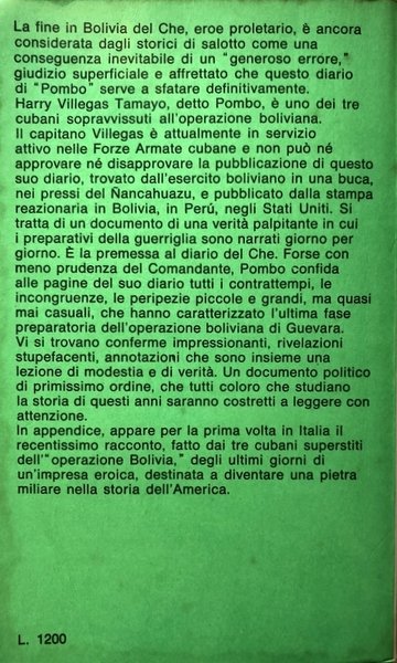 Soggetti: Ernesto Che Guevara, Biografie, Diario, Memorie, Scritti, Documenti inediti, Lettere, Epistolario, Corrispondenza, Bolivia, Marxismo, Comunismo, Resistenza, Guerriglia, Classici, America Latina, Fidel Castro, Cuba, Marcos, Guerriglieri, Tattica, Strategie, L'Avana, Santa Cruz, Braulio, Rio Grande, Cochabamba, Morte, Pombo, Eroi, Harry Villegas Tamayo, Forze armate, Operazione boliviana, Imprese, Testimonianze, Libri Vintage, Anni Sessanta, Guerra Fredda, Rivoluzione cubana, Crisi, Alleanza, Progresso, Kennedy, Stati Uniti, Eduardo Frei, Revolucion, Comandante, Contestazione, Impegno politico, Régis Debray, Focos, Montagne, Three years later, Combatant, Che's Guerrilla Movement in Bolivia, Controversy, Ñancahuazú, Corvée, Benigno, Nacahuasu, Accampamento, Granoturco, Sentiero, Avanguardia, Pablito, Camiri, Feriti, Prigionieri, 1966-67, Biographies, Diary, Memories, Writings, Unpublished Documents, Letters, Letters, Correspondence, Communism, Resistance, Classics, Guerrillas, Tactics, Strategies, Havana, Death, Heroes, Armed Forces, Bolivian Operation, Commander, Firms, Testimonies, Years Sixties, Cold War, Cuban Revolution, Crisis, Alliance, Progress, United States, Contestation, Political Commitment, Mountains, Encampment, Corn, Path, Avant-Garde, Injured, Prisoners