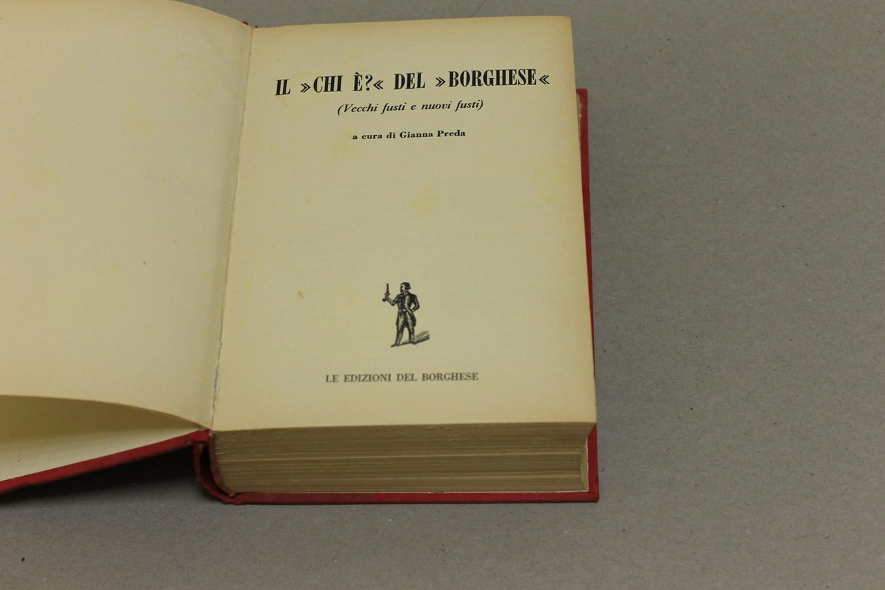 a cura di Gianna Preda Il "chi è?" del "borghese". Milano, Le edizioni del borghese 1961 - I italiano, in ottavo pp.608 Volume sui vari personaggi protagonisti degli articoli de "il borghese". Pagine ingiallite. Copertina cartonata. Illustrazioni in bianco e nero dentro e fuori testo. Taglio fra le pagine 272 e 273.