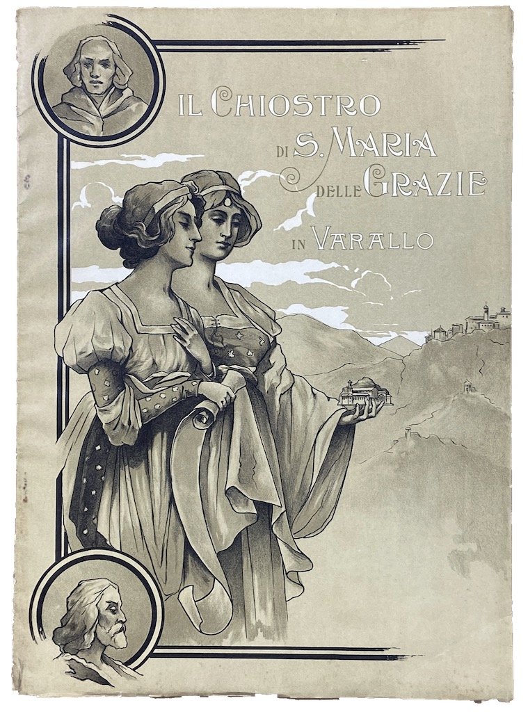 Opuscolo spillato in brossura editoriale illustrata, cm 35x25, pp 34 illustrate in nero. Lievi segni d’uso sulla copertina, buon esemplare. Numero unico pubblicato per raccogliere fondi per il restauro ed ostacolare la parziale demolizione del convento di S. Maria delle Grazie proposta dal Consiglio comunale di Varallo nel gennaio 1904 allo scopo di costruire un edificio scolastico. L’industriale Luigi Chiara e lo scultore Casimiro Debiaggi si posero in testa ad un movimento di protesta che raccolse le adesioni di numerosi artisti ed architetti preoccupati delle sorti di questa “culla dell’arte Gaudenziana”. Il fascicolo si apre con un accorato appello di Ercole Bonardi e una Cronaca dell’Agitazione per la conservazione del Convento di S. M. delle Grazie (firmata G.C.B.) ricca di documenti e notizie, seguono scritti sull’arte e la storia del monumento di Ethel Halsey, Alfonso Chiara, Camillo Verno, Attilio Piovano, G. C. Barbavara, A. R. Ottino, Antonio Massara, L. Bistesi; una tavola stampata in rosso presenta tre sonetti di Gaudenzio Miglio dedicati ai tre fiumi della Valsesia (Sermenza, Mastallone, Sesia) contornati di illustrazioni di gusto liberty, come la bella copertina litografica in bicromia. Non comune.