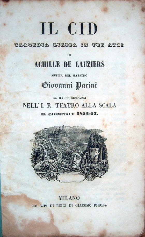 Il Cid. Tragedia lirica in tre atti di Achille De Lauziers. Musica del Maestro Giovanni Pacini. Da rappresentarsi nell'I. R. Teatro alla Scala il Carnevale 1852-53