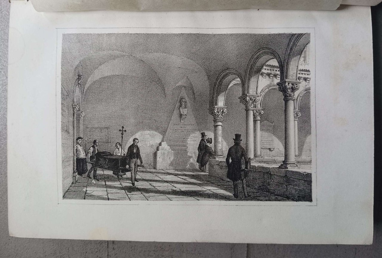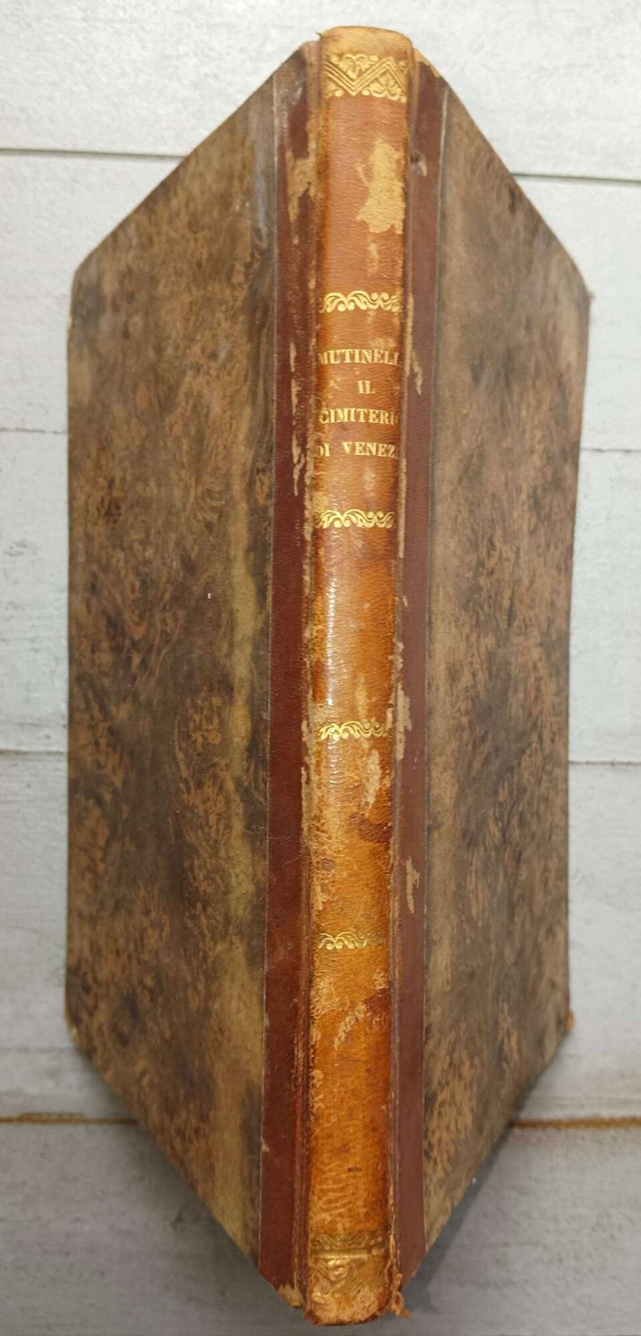 >in-8 (mm 240x165)i necrologi sono così distribuiti: Isola di S. Michele...: pp.13, (2b); Bartolomeo Zender: 1 inc, pp. 9, (2b); Nicolò Pasqualigo:1 inc, pp. 10, (2b); Leopoldina: 1 inc, pp. 8; Giuseppe Maria Puiati: 1 inc.,pp. 11, (1); Massimilla: 1 inc., pp. 10, (2); Tommaso Chelli: 1 inv, pp. 8, (2); Le suore della visitazione: 1 inc, pp. 9; Isabella Cromer Mutinelli: 1 inc, pp. 13; Giovanni Marchesi: 1 inc., pp. 12; Girolamo Silvio Martinengo: 1 inc, pp. 15; G. Francesco di Fratnich: 1 inc, pp. 6; 4 di indici. Legatura mezza pelle, titolo oro e fregi al dorso. Viignetta al titolo. Raccolta di necrologi di personaggi illustri sepolti nei cimiteri di Venezia. Esemplare fiorito.