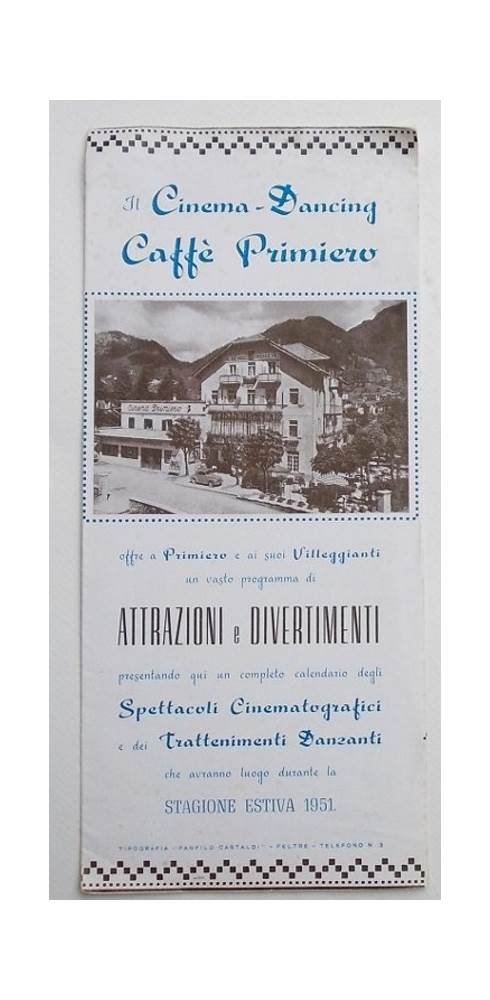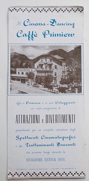 Il Cinema-Dancing Caffè Primiero offre a Primiero e ai suoi Villeggianti un vasto programma di attrazioni e divertimenti. che avranno luogo durante la stagione estiva 1951.