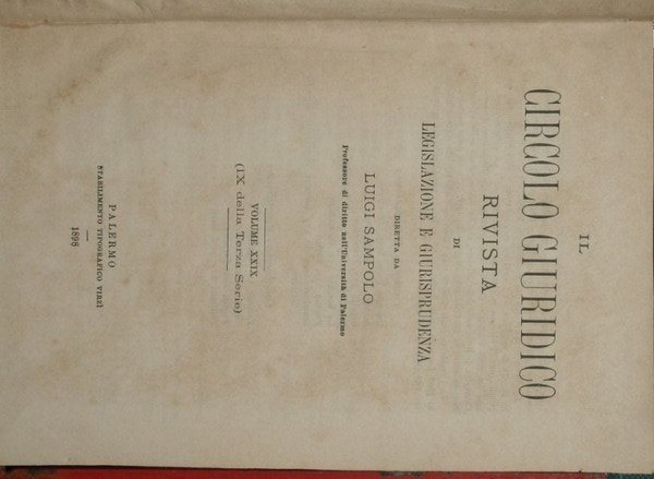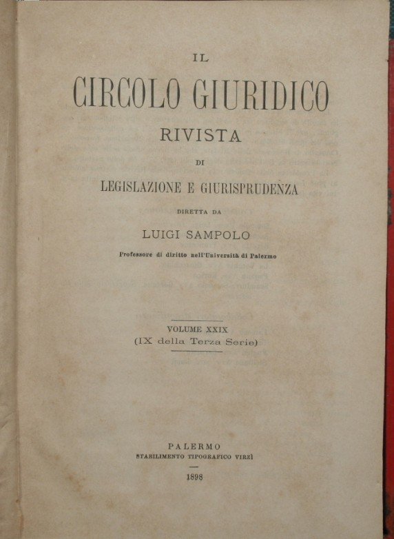 Rivista di legislazione e giurisprudenza - Diretta da Luigi Sampolo - Collana Il circolo giuridico. Terza serie - n. 9 - in 8° - pp.800 pagine circa - Tela con titolo in oro al dorso - Fascicoli legati erroneamente con conseguente numerazione delle pagine sfalsata