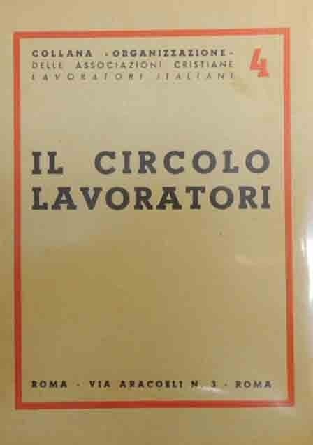 Il circolo lavoratori, A.c.l.i., Roma s.d. (194?), pp. 37, cm 17, opuscolo spillato. Collana Organizzazione, n. 4. Indice: Come si fonda il circolo – Elementi esterni del circolo – Organizzazione tecnica – Elementi burocratici del circolo – Attività del circolo – L’anno sociale. Lievissimi segni del tempo alla copertina, per il resto ben conservato.