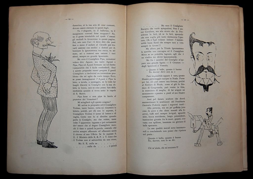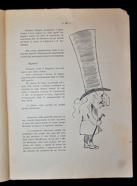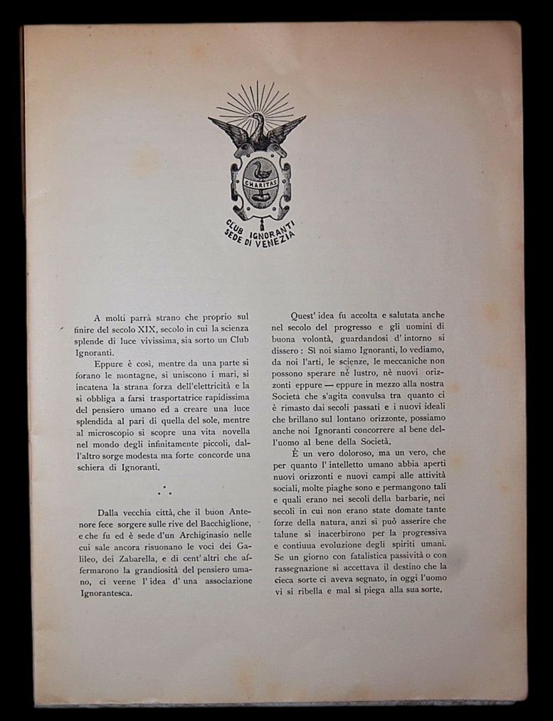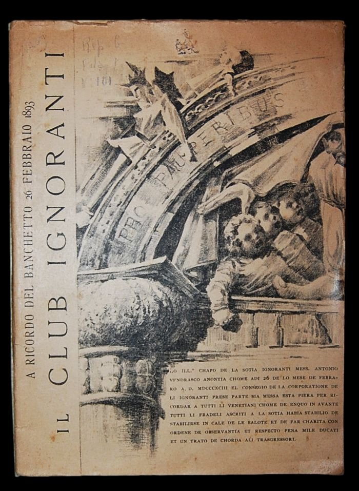 In 4° (27x20,5 cm); 35, (1) pp. Brossura editoriale illustrata. Rarissima pubblicazione satirica, nessun esemplare censito in ICCU che illustra gli avvenimenti di una celebre cena tenuta dal Club degli Ignoranti veneziano (con anche lintervento dei Soci di Murano) il giorno, 26 febbraio 1893 organizzato dagli Ignoranti per ringraziare le istituzioni cittadine e la famiglia reale per la carità fatta ai bambini bisognosi veneziani nel natale del 1892. Lopera, oltre ad un breve excursus storico della nascita del Club degli Ignoranti veneziano e il tratteggio delle finalità dello stesso, fornisce una descrizione minuziosa e scherzosa degli avvenimenti e dei discorsi che si tennero durante il banchetto. Il testo è corredato da divertenti caricature anche a metà foglio. Il Club degli Ignoranti nacque a Padova la sera del 2 settembre 1889 presso Il Ristorante-Trattoria Monti Vecchi in Stra Maggiore a Padova oggi via Dante, quando si incontrarono per quella cena eccezionale, e quellincontro e quella data passeranno alla storia. Durante la serata, come ci racconta il cronista della Storia di un Club del 1981, un tavolo di habitués si faceva maggiormente notare per il brio che li animava e per la pungente burletta che metteva a dura prova la reputazione di ciascuno, mentre, centellinando il moka, ognuno badava ad incenerire il sigaro. In questo clima goliardico uno dei commensali, invece di esclamare Cameriere il conto si rivolse ai compagni di tavolo per fare la sua proposta ed aggiunse: Fondiamo un Club, un nostro Club e designiamo una sede per le nostre riunioni. Tutti ne furono entusiasti. Bisognava, però, risolvere subito due problemi fondamentali: la Sede di questo Club e il nome da dargli. Riguardo alla sede cera chi parteggiava per il Monti Vecchi e chi avrebbe preferito una saletta delle Tre Rose in Piazza Cavour. Dopo una breve discussione decisero che la sede di questo nuovo Sodalizio dovesse essere il luogo dei loro abituali incontri, cioè il Monti Vecchi. Più difficile era trovare laccordo sul nome da dare al Club. Ognuno, infatti, aveva una proposta da avanzare ed ognuno cercava di far breccia sui presenti alzando il tono della voce. Il clima si arroventò e nessuno riusciva a portare un po di calma. Sembra che ad un certo punto una delle voci più discordi abbia tuonato sdegnosamente, forse battendo il pugno sul tavolo: IGNORANTI.. Nel giro di pochi anni (o mesi come nel caso del Club veneziano che come ci dice lopera qui presentata era già attivo sul finire del 1889) succursali furono aperte a Venezia, Udine, Este, Murano, Monselice, La Spezia e Verona. Il Club veneziano si ritrovava presso la Trattoria Tre Stelle San Giuliano. Gli Ignoranti di ogni città, erano particolarmente attivi durante i periodi di Natale dove raccoglievano beneficenza e Carnevale dove davano sfogo alla loro vena goliardica con quello che essi stessi definivano un periodo di risveglio dellignoranza. I Club, molto impegnati nel sociale, ebbero anche una notevole importanza nel miglioramento delle condizioni di vita degli operai e nello sviluppo delle arti manifatturiere partecipando a manifestazione come le Fiere Campionarie. Opera rarissima ed in buone-ottime condizioni di conservazione. Nessun riferimento bibliografico è stato reperito.
