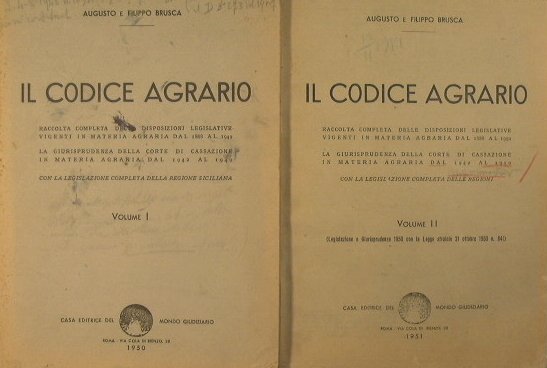 Raccolta completa delle disposizioni legislative vigenti in materia agraria dal 1888 al 1949 - La giurisprudenza della corte di cassazione in materia agraria dal 1942 al 1949 con la legislazione completa della Regone Siciliana - in 8° - pp.398 + 328 - Brossura editoriale - Due volumi - Vol.I:strappetto al dorso e al piatto inferiore - Appunti a matita al piatto superiore - Qualche sottolineatura a matita colorata- Vol.II: Rare sottolineature a matita - Scirtte a mattia al piatto superiore - Il Vol II contiene la legislazione e giurisprudenza 1950 con la legge stralcio 21 ott. 1950 n. 841