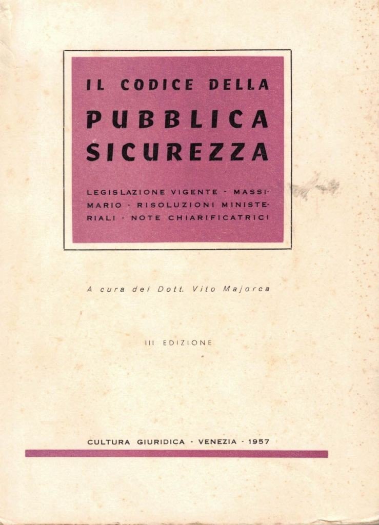 Il Codice della Pubblica Sicurezza. Legislazione vigente Massimario Risoluzioni ministeriali Note chiarificatrici, a cura del Dott. Vito Majorca, Cultura Giuridica, Venezia 1957, terza ed., pp. XIX, 261, cm 16, br. ed. con sovraccoperta. Uno strappetto senza mancanze a margine della sovraccoperta, minime fioriture, per il resto ottimo.