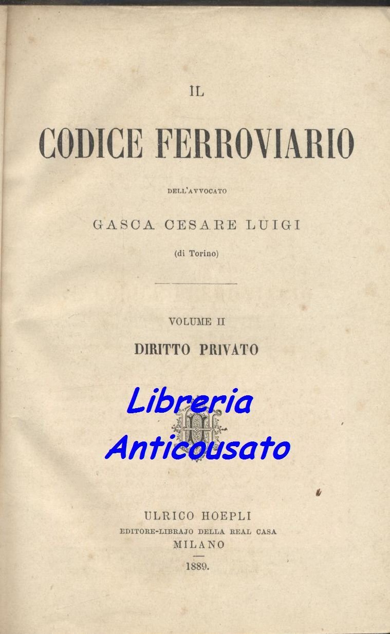 IL CODICE FERROVIARIO volume 2 DIRITTO PRIVATO di Cesare Gasca 1889 Hoepli Libro