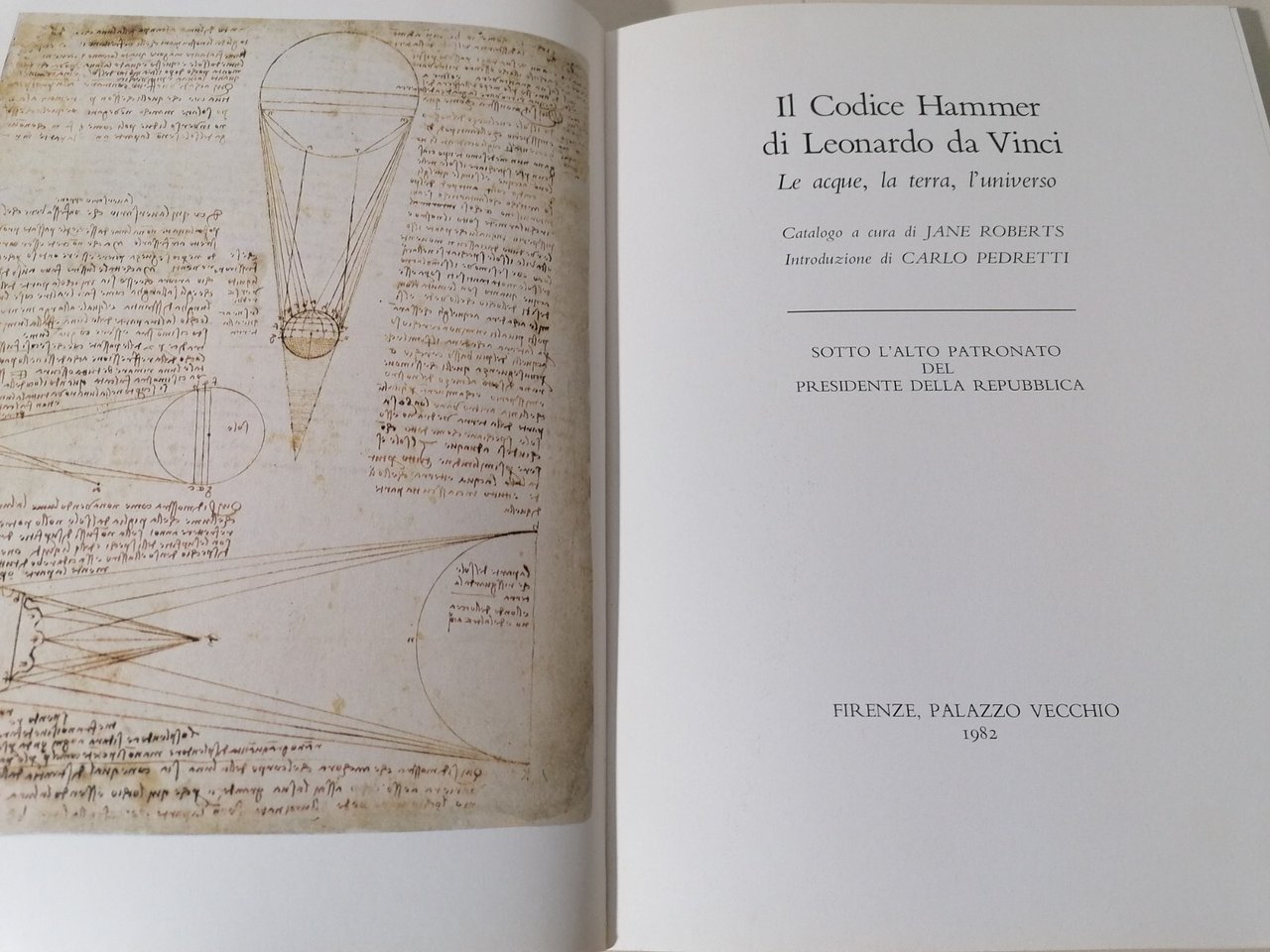 (Leonardo); Jane Roberts (catalogo a cura di) introduzione di Carlo Pedretti; IL CODICE HAMMER DI LEONARDO DA VINCI. Le Acque, La Terra, L'Universo. Firenze, Palazzo Vecchio, 1982; Firenze; 1982; Giunti Barbèra; in 4^ (28,5 x 22,5 cm); brossura in cartoncino editoriale; 130 pagine; 1 tavola a colori all'antiporta e illustrazioni e tavole in nero n.t.; discrete/buone condizioni generali, minimi segni del tempo