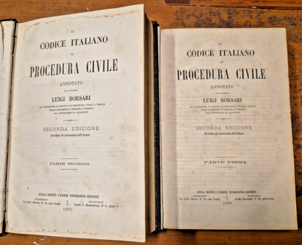 IL CODICE ITALIANO DI PROCEDURA CIVILE annotato Luigi Borsari 2 volumi 1869 Libr