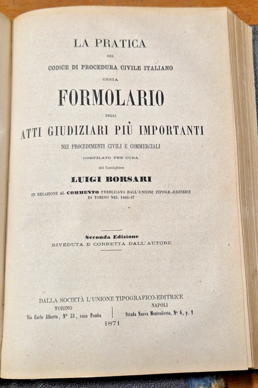 IL CODICE ITALIANO DI PROCEDURA CIVILE annotato 2 volumi + LA PRATICA DEL CODICE DI PROCEDURA CIVILE ITALIANO OSSIA FORMOLARIO DEGLI ATTI GIUDIZIARI PIU' IMPORTANTI di Luigi Borsari.