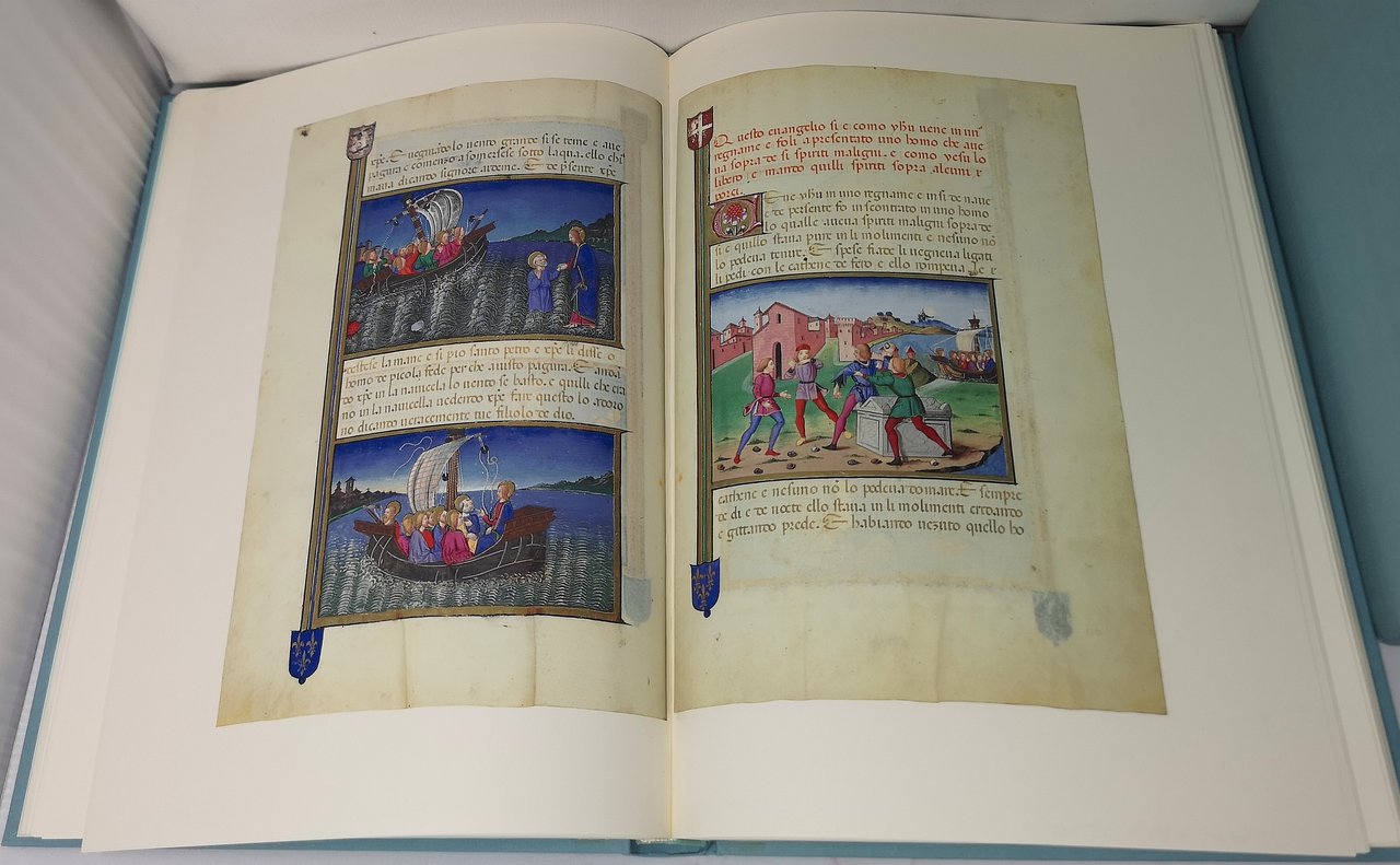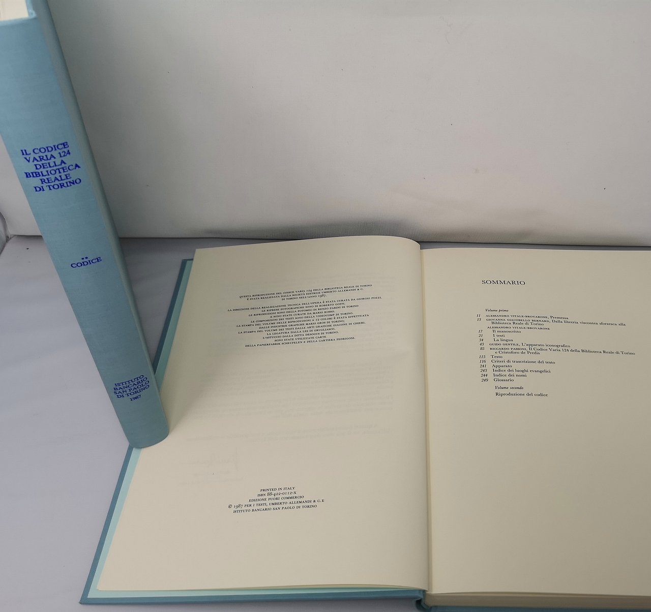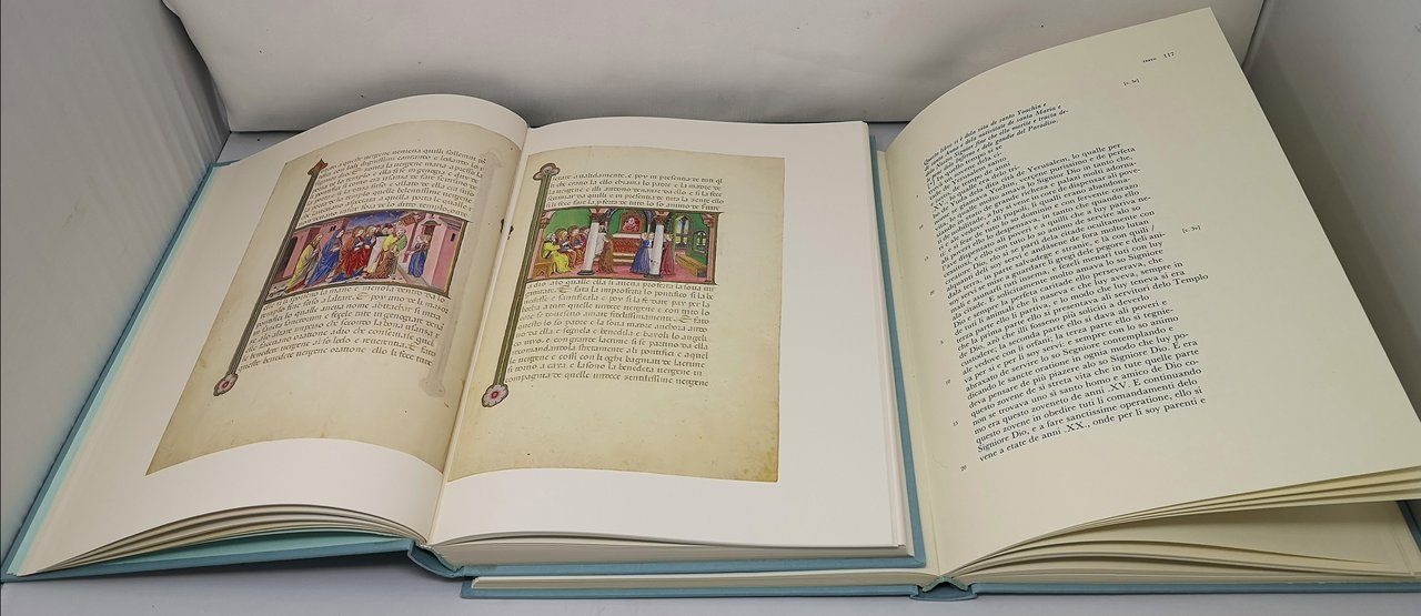 >2 voll. in-4 grande (cm 26,5 x 36), I Vol. - Testi: pp. 254 con 13 illustrazioni n.t; II Vol. - Il codice: pp. 306 di tavole a piena pagina, a colori, a riprodurre il manoscritto originale. I volumi sono stati impressi con grande cura su carte di pregio della Papierfabrik Sheufelen e della Cartiera Fedrigoni, e rilegati in seta azzurra con titoli in blu ai dorsi, entro cofanetto sempre in seta azzurra (entro astuccio editoriale in cartone con titolo su tassello). Edizione fotografica fuori commercio del Leggendario Sforza-Savoia, che riproduce tutta la stupefacente bellezza di un manoscritto altrimenti inaccessibile al pubblico, corredata da un volume in cui è riportato fedelmente il testo originale e diversi studi ad esso relativi di Alessandro Vitale-Brovarone, Giovanna Giacobello Bernard, Guido Gentile e di Riccardo Passoni. Con glossari, indici, apparati filologici. Esemplare perfetto, pari al nuovo.