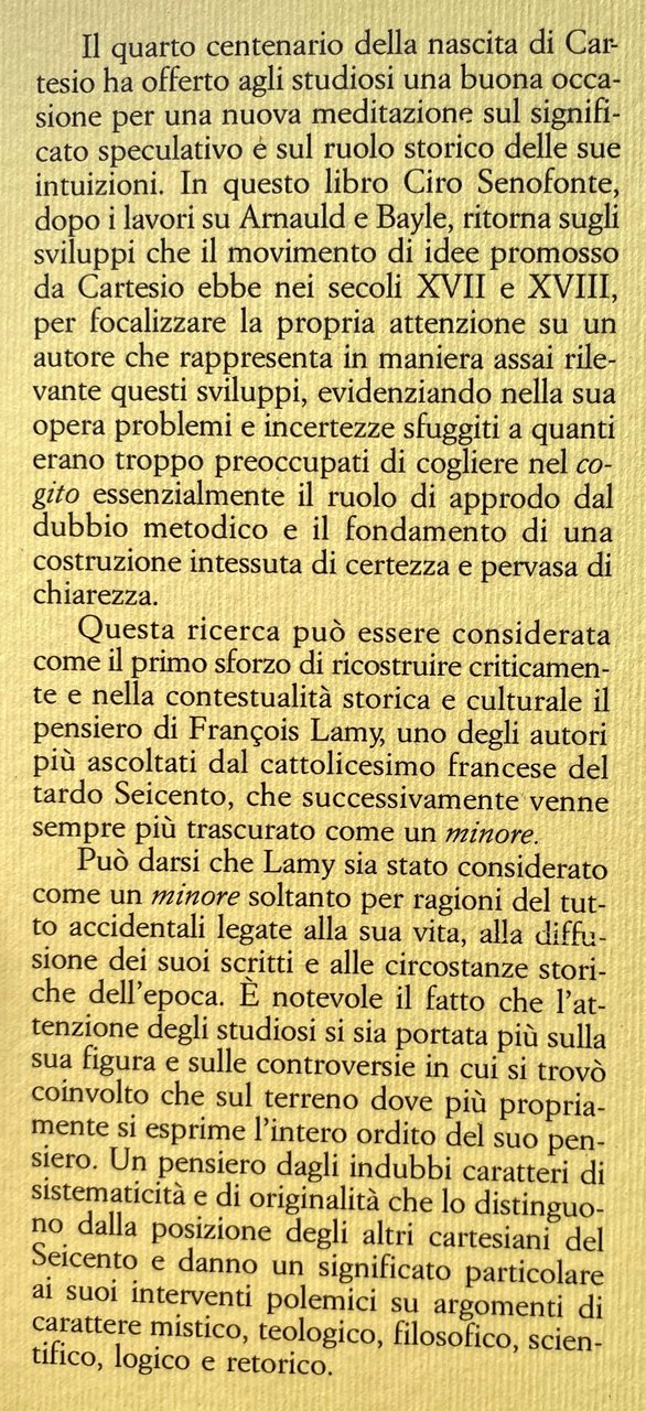 Il quarto centenario della nascita di Cartesio ha offerto agli studiosi una buona occasione per una nuova meditazione sul significato speculativo è sul ruolo storico delle sue intuizioni. In questo libro Ciro Senofonte, dopo i lavori su Arnauld e Bayle, ritorna sugli sviluppi che il movimento di idee promosso da Cartesio ebbe nei secoli XVII e XVIII, per focalizzare la propria attenzione su un autore che rappresenta in maniera assai rilevante questi sviluppi, evidenziando nella sua opera problemi e incertezze sfuggiti a quanti erano troppo preoccupati di cogliere nel cogito essenzialmente il ruolo di approdo dal dubbio metodico e il fondamento di una costruzione intessuta di certezza e pervasa di chiarezza. Questa ricerca può essere considerata come il primo sforzo di ricostruire criticamente e nella contestualità storica e culturale il pensiero di François Lamy, uno degli autori più ascoltati dal cattolicesimo francese del tardo Seicento, che successivamente venne sempre più trascurato come un minore. Può darsi che Lamy sia stato considerato come un minore soltanto per ragioni del tutto accidentali legate alla sua vita, alla diffusione dei suoi scritti e alle circostanze storiche dell'epoca. E notevole il fatto che l'attenzione degli studiosi si sia portata più sulla sua figura e sulle controversie in cui si trovò coinvolto che sul terreno dove più propriamente si esprime l'intero ordito del suo pensiero. Un pensiero dagli indubbi caratteri di sistematicità e di originalità che lo distinguono dalla posizione degli altri cartesianiani del Seicento e danno un significato particolare ai suoi interventi polemici su argomenti di carattere mistico, teologico, filosofico, scientifico, logico e retorico.