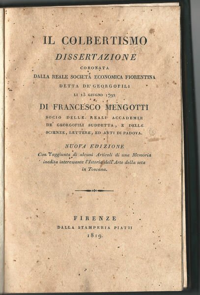 Il colbertismo. Dissertazione coronata dalla Reale Società Economica Fiorentina detta de” Georgofili li 13 giugno 1792.