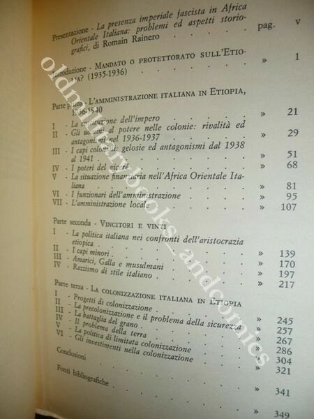 DESCRIZIONE: Mursia Milano 1980 br. ed. ill. con alette pp. 357 num. f. b/n e mappe n.t. in 8°. Dettagliato esame della dominazione italiana in Etiopia,sia negli aspetti politico militari sia in particolare in quelli economico amministrativi. CONDIZIONI: Buone/Ottime. PESO / WEIGHT: 450 gr. without package