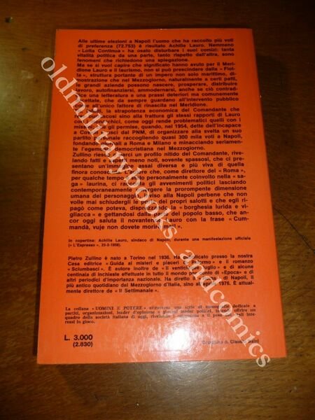 "DESCRIZIONE: Sugarco Ed. Milano 1976, br. ed. ill. col., pp. in 8°. Achille Lauro, oltre che un formidabile imprenditore, capace di trasformare la scarna flotta ereditata dal padre in un immenso impero mercantile, è stato anche una delle personalità politiche più singolari del dopoguerra italiano. Iscritto al Partito nazionale fascista nel 1933, membro della Camera dei fasci e delle corporazioni dal 1939, dopo la Liberazione trascorre alcuni mesi in prigione, accusato dagli Alleati di essersi arricchito grazie ai privilegi accordatigli dal regime. Riconquistata la libertà nell'ottobre 1945, "'o Comandante" è uno degli uomini più ricchi d'Italia. Come sindaco di Napoli, carica che ricopre dal 1951 al 1958, Lauro diventa personaggio popolarissimo e controverso, al centro di scandali finanziari e polemiche feroci sull'uso troppo disinvolto del voto di scambio. Assiste alla fine del centrismo di De Gasperi, è avversario di Fanfani ma sostiene con vigore i governi più moderati targati Dc, dialoga con il Msi di Almirante fino a riunire sotto le insegne del Partito democratico di unità monarchica i nostalgici della corona. Gaudente, donnaiolo, narcisista, padrone di quotidiani e della squadra di calcio del Napoli, dopo la morte della prima moglie Angelina sposa nel 1970, all'età di ottantaquattro anni, la giovanissima Eliana Merolla. L'"ultimo re di Napoli" muore nel 1982, ultranovantenne, al termine di una vita non priva di disgrazie (il primogenito Gioacchino muore prematuramente, la flotta mercantile finirà per essere travolta dalle inchieste giudiziarie). CONDIZIONI: Perfette. PESO / WEIGHT: 300 gr. without package"