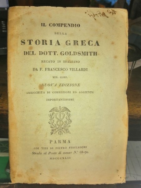 Il Compendio della Storia Greca del dott. Goldsmith recato in italiano da F. Francesco Villardi min. conv. Nuova edizione arricchitadi correzioni ed aggiunte importantissime.