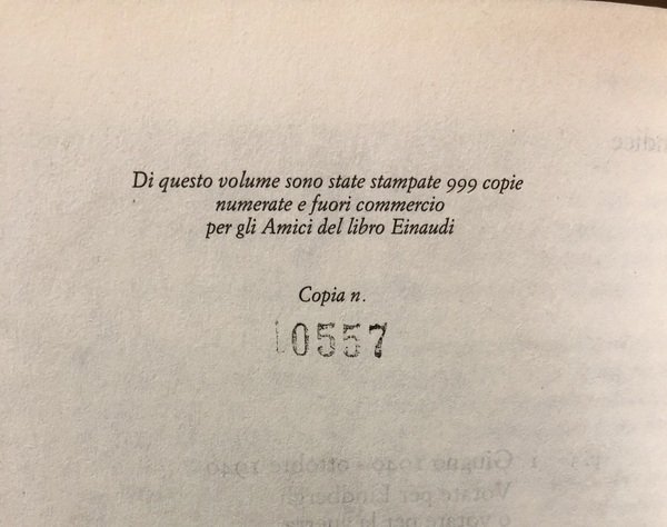 Traduzione di Vincenzo Mantovani. Copia numerata e fuori commercio. Edizione in tela rigida con pellicola dim acetato trasparente, pp 410. Edizione in tiratura limitata a 999 copie numerate e fuori commercio per gli Amici del libro Einaudi (copia n.0557).