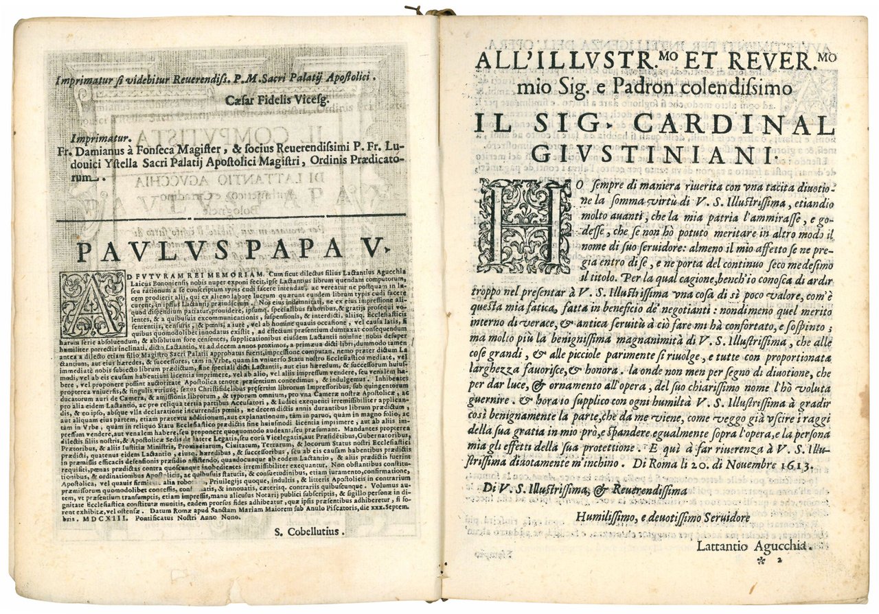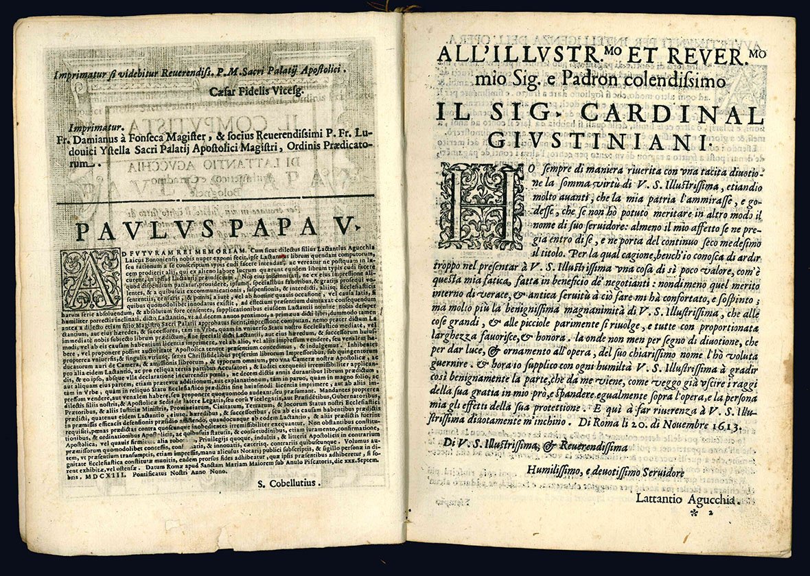 In 4to (mm 219x159); pp. [12], 176. Segnatura: *6 A-Y4. Bel frontespizio architettonico inciso in rame con in basso le armi del cardinal Giustiniani, dedicatario dell'opera. Due piccoli fori nel margine inferiore bianco del titolo, causati dalla parziale asportazione di un ex-libris settecentesco. Segni di tarlo al margine interno di alcune carte, che tuttavia non interessano il testo. Nel complesso ottima copia. Cartone recente, risguardi antichi. Firma di appartenenza coeva di un certo Flaminio Marcellini.