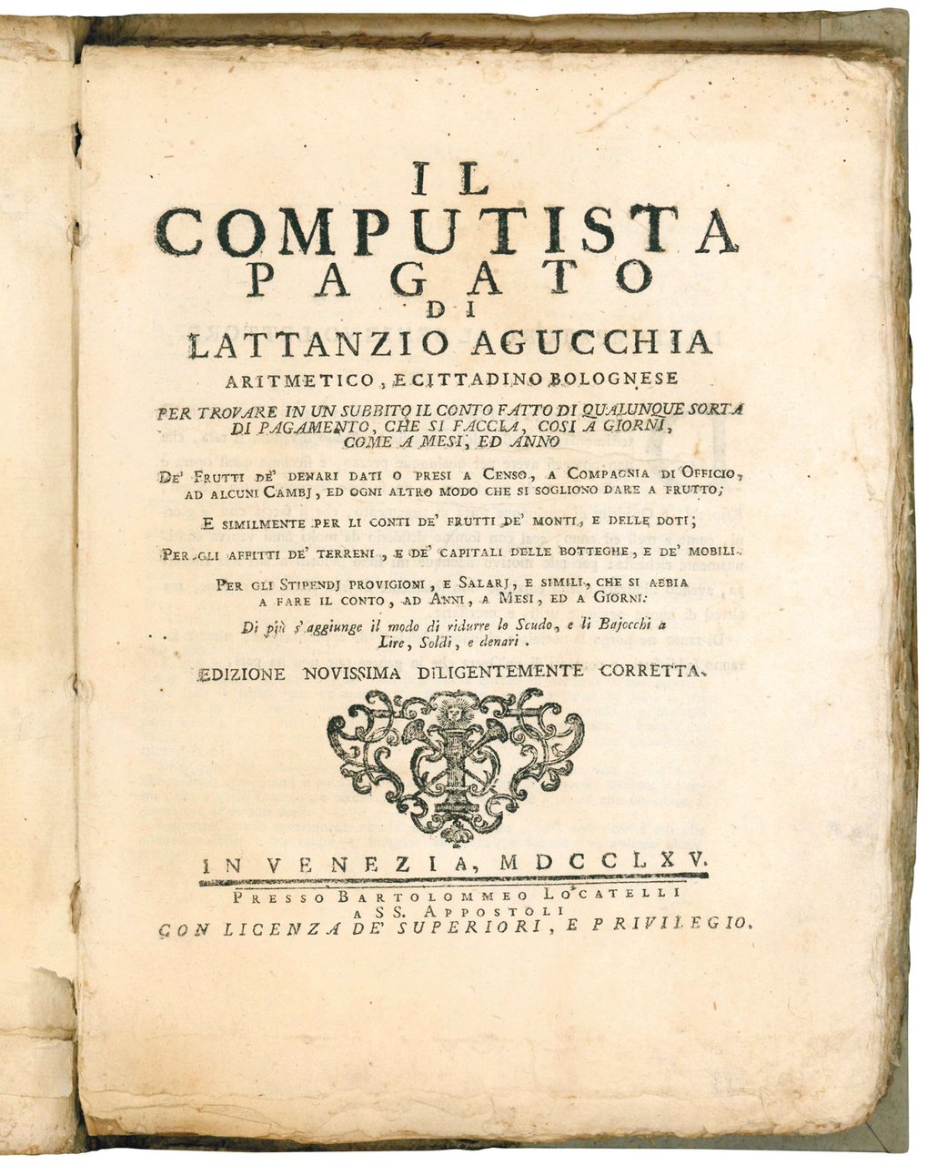 Il computista pagato di Lattantio Agucchia aritmetico, e cittadino bolognese per trovare in un subbito il conto fatto di qualunque sorta di pagamento, che si faccia, cosi à giorni, come a mesi, ed anno ... Edizione novissima diligentemente corretta.