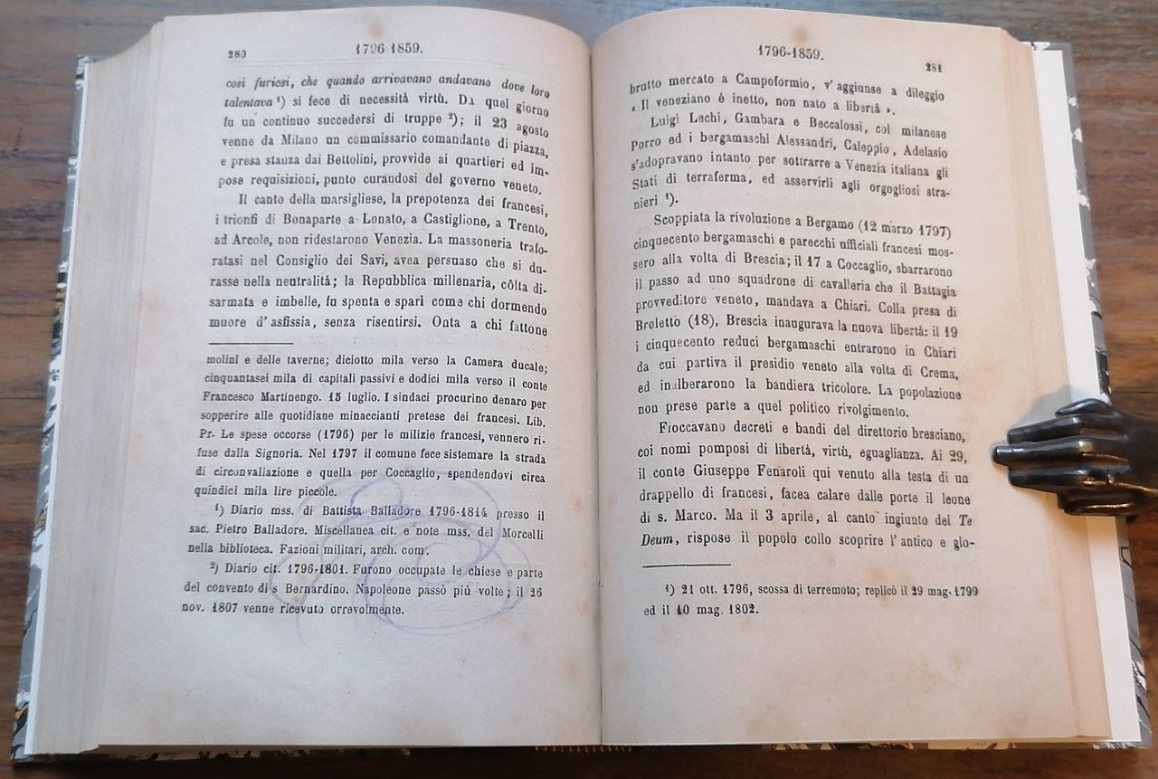(Lombardia; Provincia di Brescia; Storia locale) In 8° piccolo (cm 20 x 13,5), legatura moderna in mezza tela, al dorso tassello in pelle con titoli dorati, carta marmorizzata ai piatti, conservata la copertina anteriore della brossura editoriale, pp. 374,(2). Mancanze e restauro alla copertina della brossura, una sigla a penna al frontespizio, una sottolineatura a pagina 246, leggere tracce di matita colorata a pagina 280, peraltro ottimo stato di conservazione. Edizione originale.