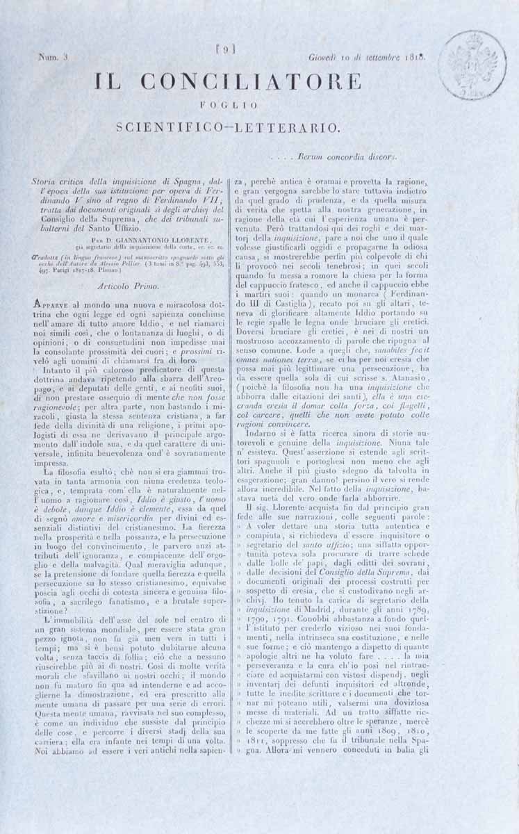 IL CONCILIATORE. - Foglio scientifico-Letterario.
