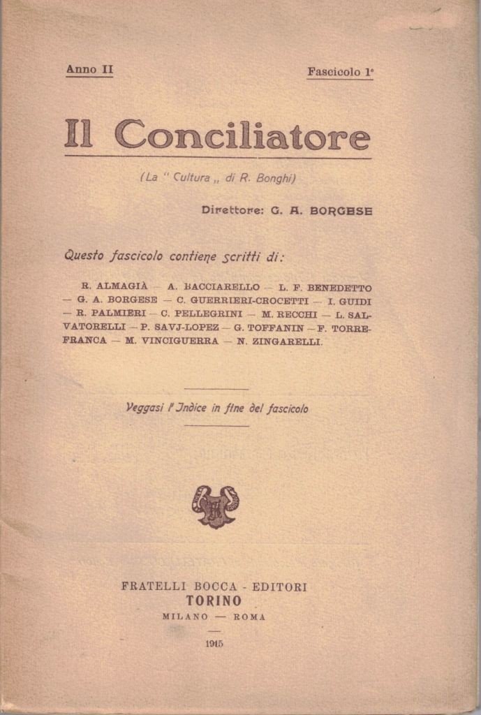 Il Conciliatore. (La Cultura di R. Bonghi), direttore G. A. Borgese, Fratelli Bocca Editori, Torino, anno II, fascicolo I, 1945, pp. 174, cm 24, br. ed. Indice: G. A. Borgese, La letteratura italiana alla vigilia della guerra – G. Fatini, La prima giovinezza di Giosué Carducci e A. Meozzi, Il Carducci umanista (rec. di C. Pellegrini) – G. Gozzi, La Gazzetta veneta per la prima volta riprodotta nella sua letteraria integrità con proemio e note di Antonio Zardo (rec. di G. Toffanin) – M. E. Cosenza, Francesco Petrarca and the devolution of Cola di Rienzo (rec. di N. Zingarelli) – V. De Bartholomaeis, Il Ritmo Lucchese del 1213 (rec. di C. Guerrieri-Crocetti) – M. V., Nota (su A. Padovan) – E. Rigal, La signification philosophique du Satyre de Victor Hugo (rec. di L. Foscolo Benedetto) – E. Schuré, La druidesse précédée d’une étude sur le réveil de l’ame celtique (rec. di A. Bacciarello) – C. Lecigne, Madame Desbordes-Valmore (rec. di A. Bacciarello) – L. Lahovary, Les lauriers et le glaives (rec. di A. Bacciarello) – G. Muoni, Carlo Baudelaire (rec. di M. Recchi) – M. Recchi, Nota sull’Heptaméron di Margherita d’Anouleme – Id., Nota su henry Houssaye, Le dernier jour de Napoléon à la Malmaison – M. Cervantes, Gli intermezzi tradotti ed illustrati da Alfredo Giannini (rec. di P. Savj-Lopez) – N. A. Cortés, Don Hernando de Acuna (rec. di R. Palmieri) – M. Vinciguerra, Rassegna inglese (A. W. Verral, Lectures on Dryden) – Id., Nota (su R. Lipari) – Dissonanza. Composizioni musicali italiane moderne raccolte da G. Bastianelli e I. Pizzetti (rec. di F. Torrefranca) – C. Cuignebert, Le problème de Jésus (rec. di L. Salvatorelli) – A. Harnack, Storia del dogma (rec. di L. Salvatorelli) – P. Allard, Storia critica delle persecuzioni (rec. di L. Salvatorelli) – A. Manaresi, L’impero romano e il cristianesimo (rec. di L. Salvatorelli) – E. Schwarz, Kaiser Constantin und die christliche Kirche (rec. di L. Salvatorelli) – H. Kock, Konstantin der Grosse und das Christentum (rec. di L. Salvatorelli) – A. Philippson, Das Mittelmeergebiet. Seine geographische und kulturelle Eigenart (rec. di R. Almagià) – The commentaires of Isho dad of Mery Bishop (rec. di I. Guidi) – M. V., Nota su The roman elegiac poets. Minima brunitura della carta, per il resto perfetto. Intonso.