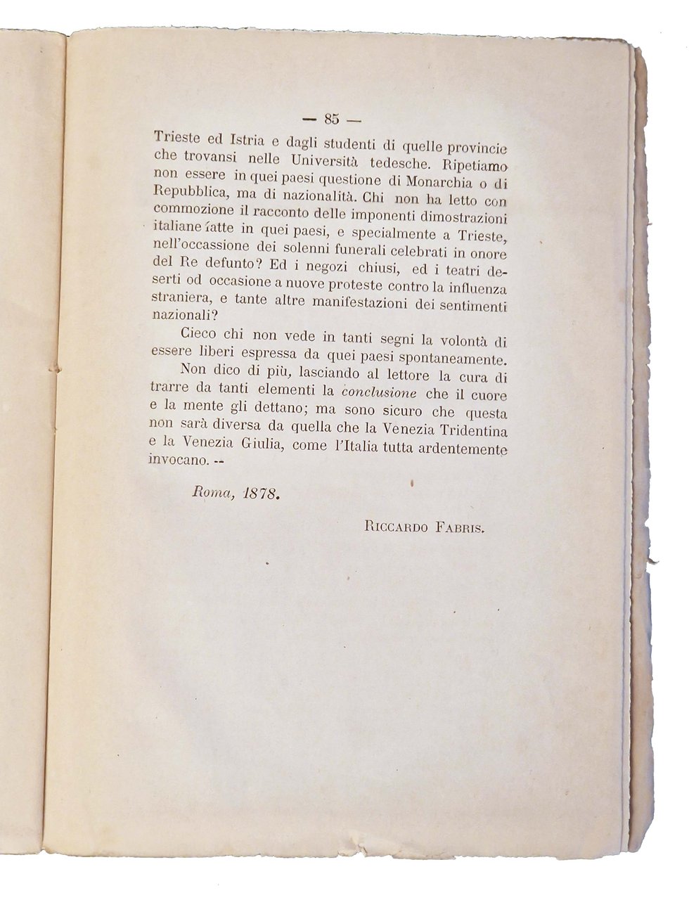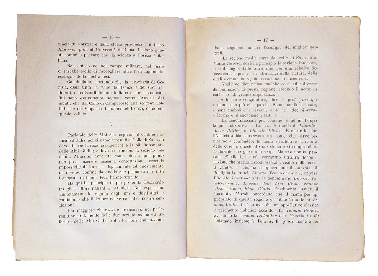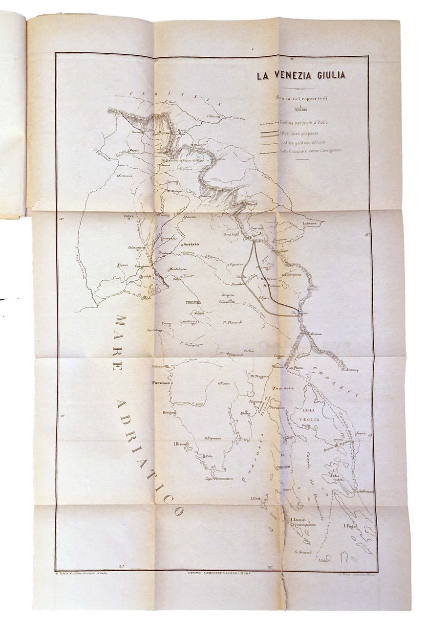 Un volume, 192x138 mm, leg. in brossura editoriale, con titolo in nero al piatto anteriore; pp. 85, [3], [1] c. geogr. ripiegata (carta della Venezia Giulia in scala 1:576000). Rif.: IT\ICCU\TO0\0730057. Cond.: Segni d'uso alla leg. (bruniture e allcuni piccoli strappi ai margini della copertina). Carte pulite, parzialmente intonse. Esemplare molto buono.