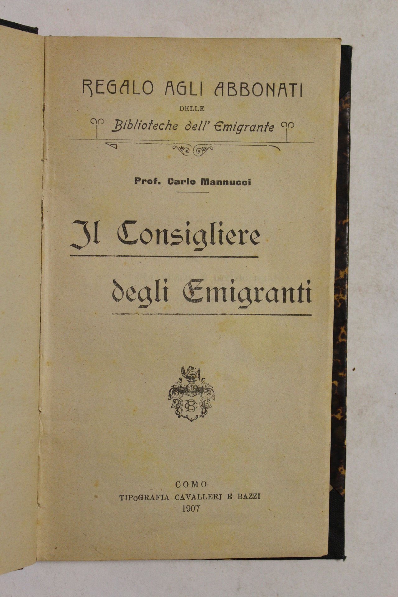 In 16° (mm 174x96); pagg.VI, (3), 10-181. Mezza tela coeva muta nera con piatti marmorizzati. Interessante guida per gli emigranti nei vari paesi: offre consigli, indirizzi, spiega diritti e doveri dell'emigrante, tratta di assicurazioni mediche, vi è un prontuario linguistico ed uno medico. Bell'esemplare. Non comune