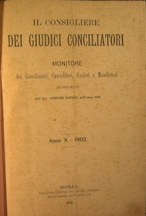 Monitore dei conciliatori, Cancellieri, Uscieri e mandatari - Fondato dall'avvocato Augusto Santini nell'anno 1893 - in 4° - pp.XXXVII + 382 +384 + XXXV + 384 + 376 + XXXVI + 368 + 384 + XXXIV + 384 + 368 - Mezza pelle - 4 volumi - Evidenti abrasioni alle legature - I volumi posseduti riguardano gli anni: 1900-1901; 1902-1903; 1904-1905; 1906-1907