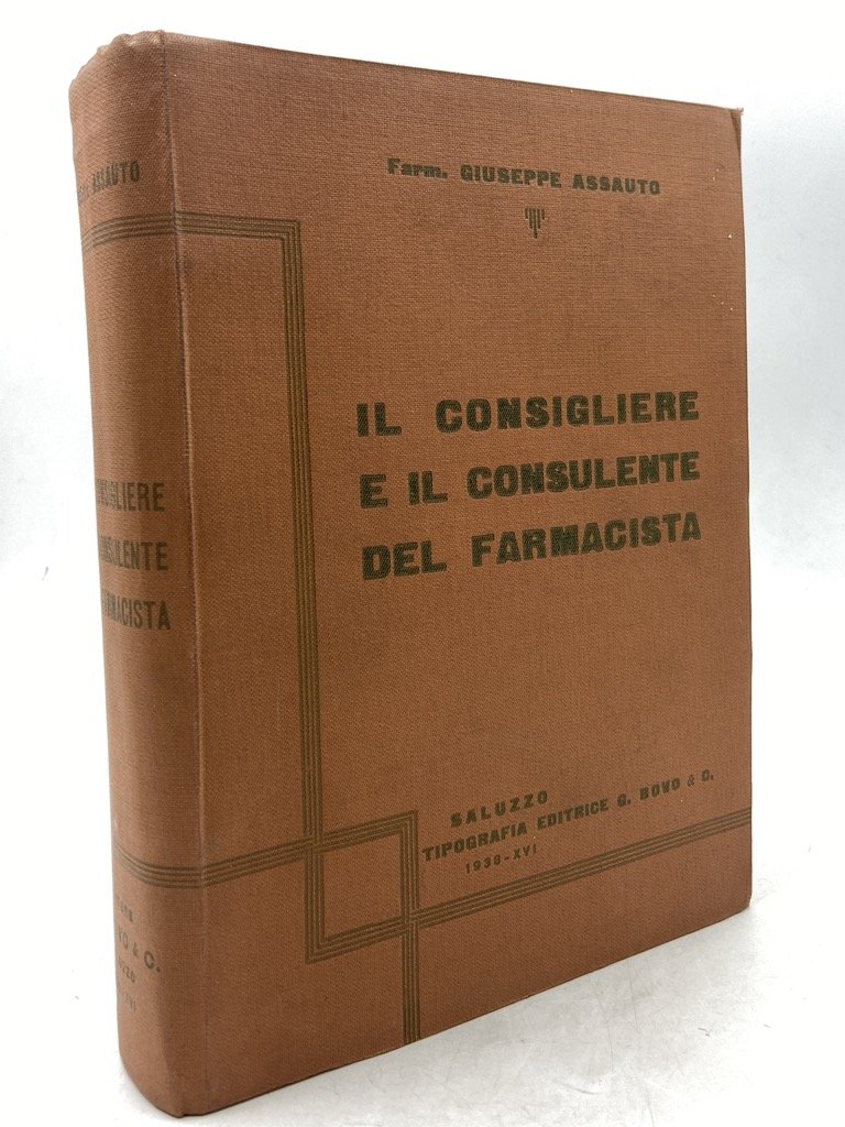 Tela editoriale, cm 22 x 18, pp XVIII (2) 919 (1) + (16) di catalogo editoriale in velina rosa, ritratto dell’autore su carta forte. Corposo compendio di informazioni pratiche, professionali, legali, scientifiche ecc composto da G. Assauto, presidente della Federazione degli Ordini dei Farmacisti d’Italia e fondatore e a lungo direttore del bollettino dell’ente, «Il Farmacista».