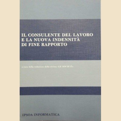 Il consulente del lavoro e la nuova indennità di fine rapporto, a cura della redazione della rivista Le Società, Ipsoa Informatica, s.l. 1982, pp. 196, cm 24, br. ed. Alla quarta di copertina: Edizione speciale fuori commercio in esclusiva per i consulenti del lavoro. Timbro di biblioteca estinta alla prima di copertina e alla prima carta bianca. Alcune sporadiche sottolineature a evidenziatore e annotazioni a biro, per il resto ben conservato.