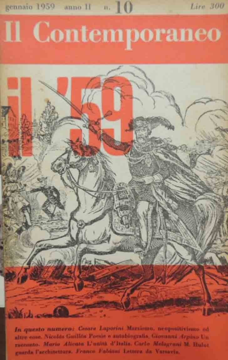 Il Contemporaneo, anno II, numero 10, gennaio 1959, pp. 147, ill. b.n., 6. C. di tavv. f.t. ill. b.n., cm 21, br. ed. Indice: Cesare Luporini, Marxismo, neopositivismo e altre cose – Umberto Cerroni, Democrazia e regime borghese – Paolo Chiarini, Brecht tra espressionismo e marxismo – Nicolàs Guillén, Poesie e piccola autobiografia – Giovanni Arpino, Il talento umano – Idee del tempo – Statistiche e notizie – Franco Fabiani, Lettera da Varsavia. Cattolici polacchi – Ivo Dalla Costa, Lettera da Treviso. L’egemonia clericale e l’azione ideale dei comunisti in una provincia veneta – Schede (I libri, Segnalazioni, I dischi). Minime tracce d’uso, lieve brunitura della carta, per il resto ben conservato.