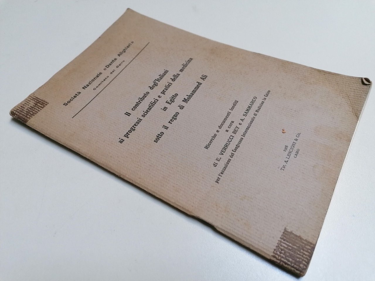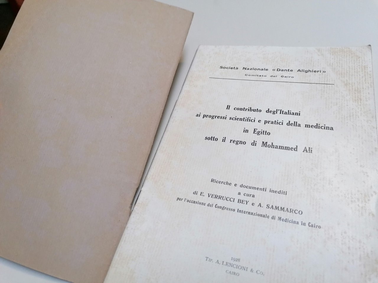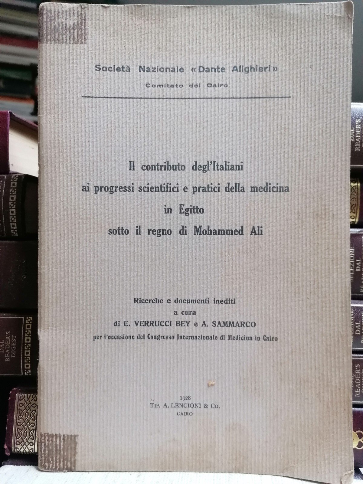 Il contributo degl'italiani ai progressi scientifici e pratici della medicina in Egitto sotto il regno di Mohammed Ali Ricerce e documenti inediti a cura di E. Verrucci Bey e A. Sammarco Congresso internazionale di Medicina in Cairo Lencioni, 1928 Brossura, in 8^, 34 pp. Vera rarità bibliografica. Condizioni accettabili compatibilmente con l'età. La copertina è un po' staccata. Interno buono