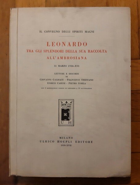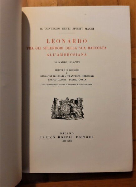 Il Convegno degli Spiriti Magni. Leonardo tra gli Splendori della sua raccolta all'Ambrosiana. 31 marzo 1938 - XVI. Letture e discorsi di Giovanni Galbiati - Francesco Orestano - Enrico Carusi - Pietro Gorla.