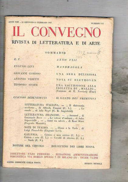 Il Convegno rivista (mensile) di letteratura e arte. Disponiamo: del 1927 nacante fel fasc. n° 6, mente il primo è l'ultimo è doppio. Il n° 7 è intitolato disordine e dolore precoce di Thomas Mann; il n° 9 contiene dopo la battaglia di Giovanni Comisso; il n° 10 omaggio a Rainer Maria Rilke.
