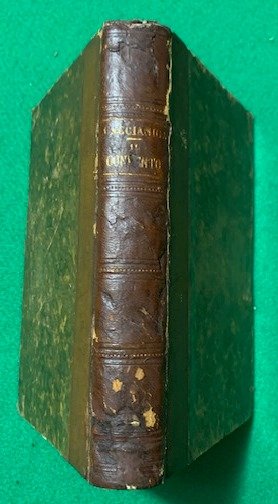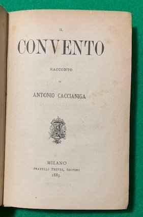 In 8°; (4), 272, (4) pp. Legatura coeva in mezza-pelle con piatti foderati con carta marmorizzata, qualche lieve difetto al dorso. Esemplare in buone-ottime condizioni di conservazione. Bell'ex-libris applicato al piato anteriore. Prima edizione, assai rara di questo romanzo del noto uomo politico, patriota e scrittore veneto, Antonio Caccianiga (Treviso, 30 giugno 1823 Maserada sul Piave, 22 aprile 1909). In giovane età Caccianiga studiò storia naturale ed economia rurale ma poi, le sue idee politiche antiautriache e liberali lo portarono a dover girovagare per l'Italia e l'Europa per cercare di sottrarsi alla all'interesse della polizia austriaca. Fu così che visse in Piemonte, Svizzera, Francia ed Inghilterra con scarsi mezzi dato che il governo austriaco aveva sequestrato i beni paterni. Nel 1854 riuscì a tornare a Treviso dopo aver ricevuto l'amnistia, grazie ad un amico che lo ospitò nella sua villa a Masareda sul Piave. Vivacissimi furono i suoi collegamenti i patrioti e gli intelletuali italiani esuli. Politico dai numerosi contatti, durante la sua vita ricoprì diverse cariche prestigiose fra le quali quella di podestà e sindaco di Treviso, sindaco di Maserada, prefetto di Udine, Presidente del Consiglio della Provincia di Treviso, consigliere della Scuola di Enologia di Conegliano, Presidente dell'Ateneo di Treviso e Deputato del Regno d'Italia. Nel 1866 fu, anche, membro della delegazione che presentò a Re Vittorio Emanuele II i risultati del plebiscito per l'annessione del Veneto al Regno d'Italia. Caccianiga fu anche un prolifico giornalista e scrittore, autore di romanzi risorgimentali ed antiaustriaci come "I vampiri e l'incubo", "Il convento", "Brava gente", "Il roccolo di Sant'Alipio" e "Il proscritto". Tra le sue opere figurano anche elogi alla vita campestre, come "La vita campestre", "Il dolce far niente", "Le cronache del villaggio", "Il bacio della contessa Savina", "Frondeggi", e "Lettere dun marito alla moglie morta". Nota è anche la sua opera dedicata a Trevido, "Ricordo della provincia di Treviso". La sua opera fu molto apprezzata tanto che di lui paralrono in toni assai positivi Bendetto Croce e Enzo Demattè. Molte delle sue opere sono assai rare come ad esempio, quella qui presentata.