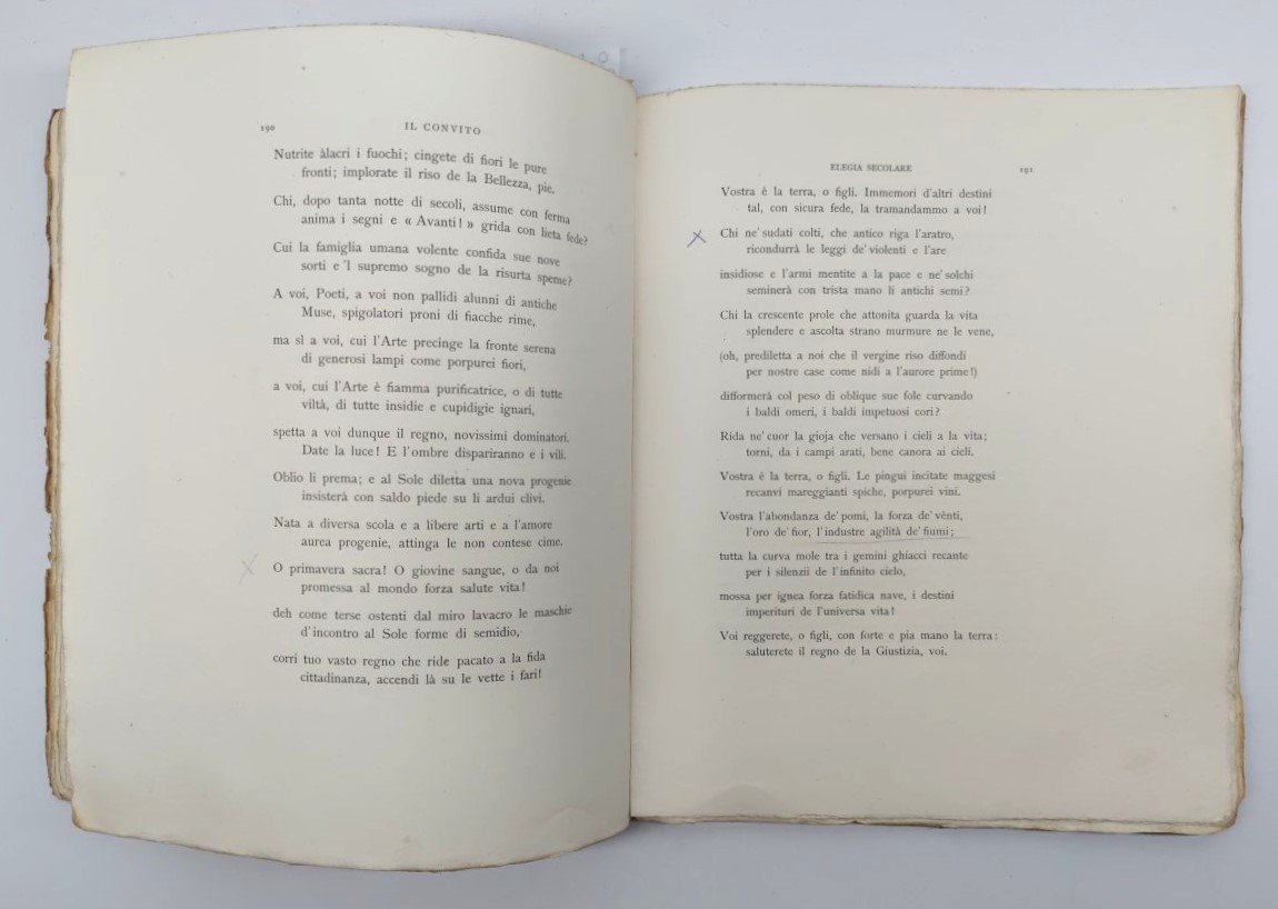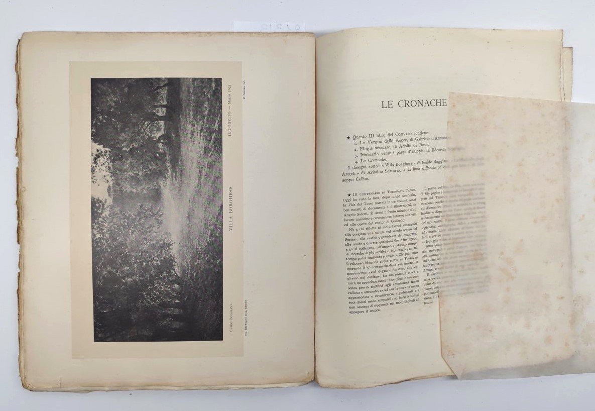 storica rivista fondata e diretta da Adolfo De Bosis, fra le più importanti della cultura italiana a cavallo tra Otto- e Novecento brossura originale disegnata da Giuseppe Cellini con elaborati motivi ornamentali e floreali incisi in xilografia. Ogni fascicolo è illustrato con belle tavole riprodotte in fotoincisione f.t. e n.t. di artisti come Giuseppe Cellini, Giulio Aristide Sartorio, Francesco Paolo Michetti, Alessandro Morani, Lawrence Alma-Tadema, Elihu Vedder, Enrico Coleman, ecc. La rivista, pubblicata da De Bosis a proprie spese, fu il tipico frutto dell'estetismo decadente fin de siècle (con echi ancora palpabili del gusto preraffaellita) e adunò alcuni dei maggiori nomi delle lettere italiane del tempo, D'Annunzio in testa a tutti. Una sorta di positivismo da superuomo, mescolato di spirito libertario e al tempo stesso imperialista, antipacifista, anima e arricchisce i bellissimi fascicoli, dai fregi alessandrini e dai grandi margini. È questo il momento più singolare del nostro decadentismo. e nel Convito che si riconosce il grado artistico del parnassianesimo italiano (Giorgio Petrocchi)