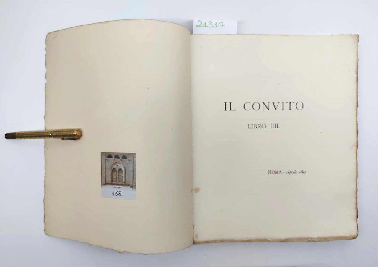 storica rivista fondata e diretta da Adolfo De Bosis, fra le più importanti della cultura italiana a cavallo tra Otto- e Novecento brossura originale disegnata da Giuseppe Cellini con elaborati motivi ornamentali e floreali incisi in xilografia. Ogni fascicolo è illustrato con belle tavole riprodotte in fotoincisione f.t. e n.t. di artisti come Giuseppe Cellini, Giulio Aristide Sartorio, Francesco Paolo Michetti, Alessandro Morani, Lawrence Alma-Tadema, Elihu Vedder, Enrico Coleman, ecc. La rivista, pubblicata da De Bosis a proprie spese, fu il tipico frutto dell'estetismo decadente fin de siècle (con echi ancora palpabili del gusto preraffaellita) e adunò alcuni dei maggiori nomi delle lettere italiane del tempo, D'Annunzio in testa a tutti. Una sorta di positivismo da superuomo, mescolato di spirito libertario e al tempo stesso imperialista, antipacifista, anima e arricchisce i bellissimi fascicoli, dai fregi alessandrini e dai grandi margini. È questo il momento più singolare del nostro decadentismo. e nel Convito che si riconosce il grado artistico del parnassianesimo italiano (Giorgio Petrocchi)