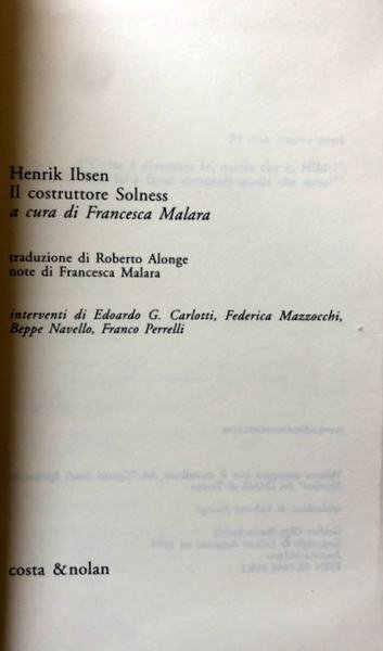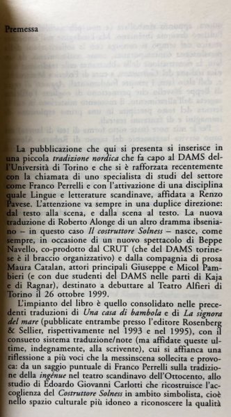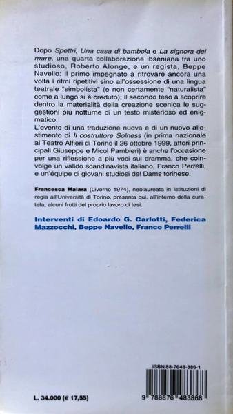 Dopo Spettri, Una casa di bambola e La signora del mare, una quarta collaborazione ibseniana fra uno studioso, Roberto Alonge, e un regista, Beppe Navello: il primo impegnato a ritrovare ancora una volta i ritmi ripetitivi sino all'ossessione di una lingua teatrale "simbolista" (e non certamente "naturalista" come a lungo si è creduto); il secondo teso a scoprire dentro la materialità della creazione scenica le suggestioni più notturne di un testo misterioso ed enigmatico. L'evento di una traduzione nuova e di un nuovo allestimento di Il costruttore Solness (in prima nazionale al Teatro Alfieri di Torino il 26 ottobre 1999, attori principali Giuseppe e Micol Pambieri) è anche l'occasione per una riflessione a più voci sul dramma, che coinvolge un valido scandinavista italiano, Franco Perrelli, e un'equipe di giovani studiosi del Dams torinese. Francesca Malara (Livorno 1974), neolaureata in Istituzioni di regia all'Università di Torino, presenta qui, all'interno della curatela, alcuni frutti del proprio lavoro di tesi. Interventi di Edoardo G. Carlotti, Federica Mazzocchi, Beppe Navello, Franco Perrelli.