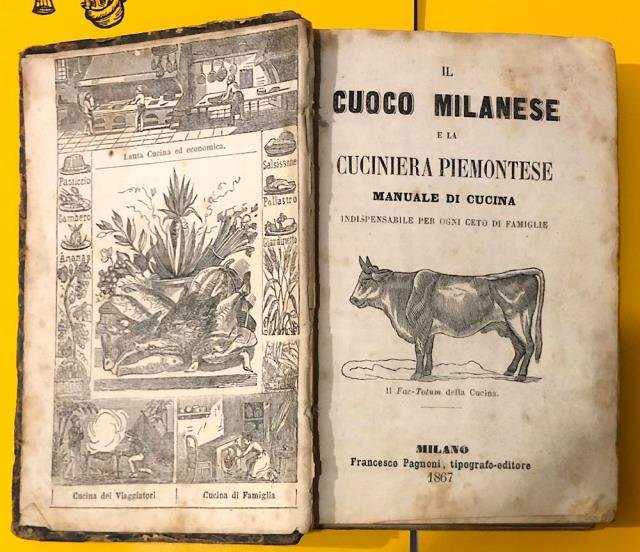 Milano, Francesco Pagnoni tipografo – editore, 1867. In 8vo piccolo, pp. 318, antip. ill. a piena pagina con incisioni in b/n, front. con ill. di una mucca incisa e con scritto «Il fac – Totum della Cucina», ricco di recenti semplici e raffinate molto chiaramente divise per paragrafi, leg. orig. in modesto cartonato marmorizz. Manca il dorso e la carta che riveste il cartone posteriore, piatti sciolti e quindi allenatato, sciolto il foglio in antiporta, interno ingiallito dal tempo ma completo e ben fruibile.